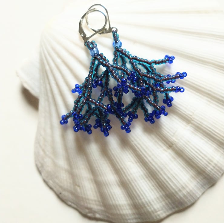 Gorgeous glass seed beads in teal and ultramarine combine for these handmade dangle earrings. The teal beads also have a subtle pinkish red tinge to them, very unusual! Ideal holiday earrings, or for dressing up on a night out. They drape softly from the ears and are very light to wear.