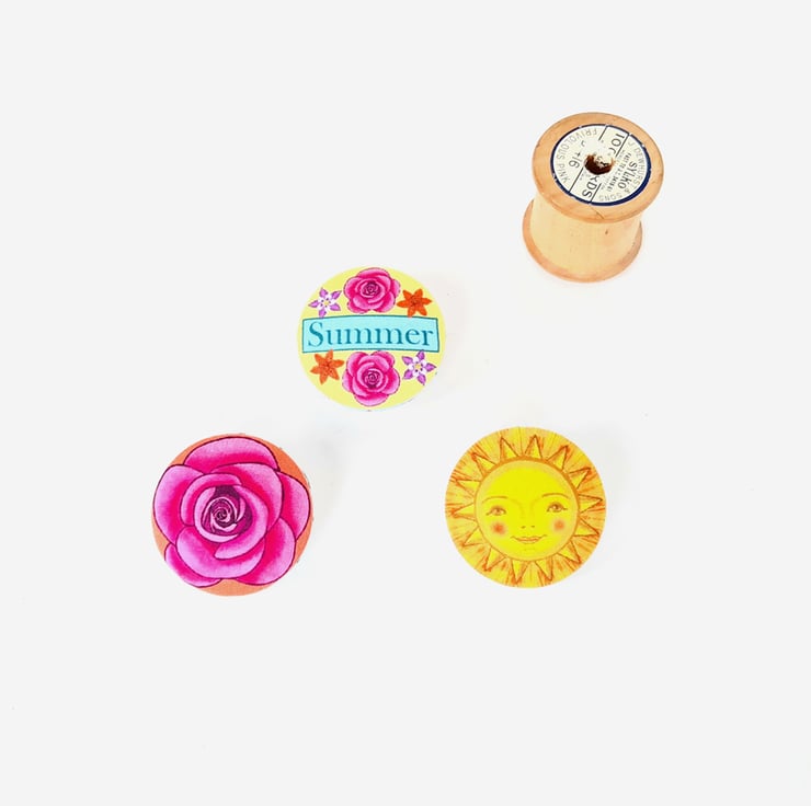 One of these pretty buttons features "Summer" text and pink roses, orange tigerlilies and aquilegia flowers another has a cute little smiling sun face and the third a lovely pink rose.