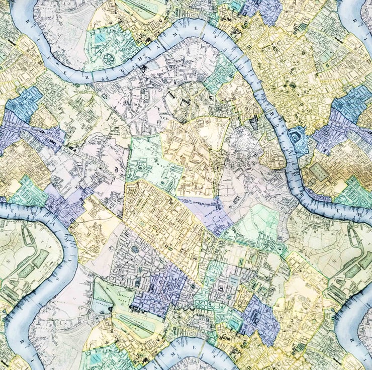 This map design shows sections from John Cary’s 1822 Plan of London. Very detailed, you can pick out the layout of streets, parks, and the course of the River Thames as it winds through the city. Each section of the capital is depicted in different pastel shades, resulting in a patchwork effect.