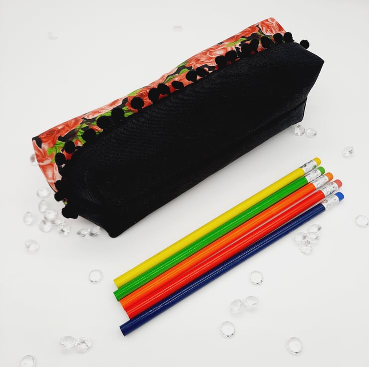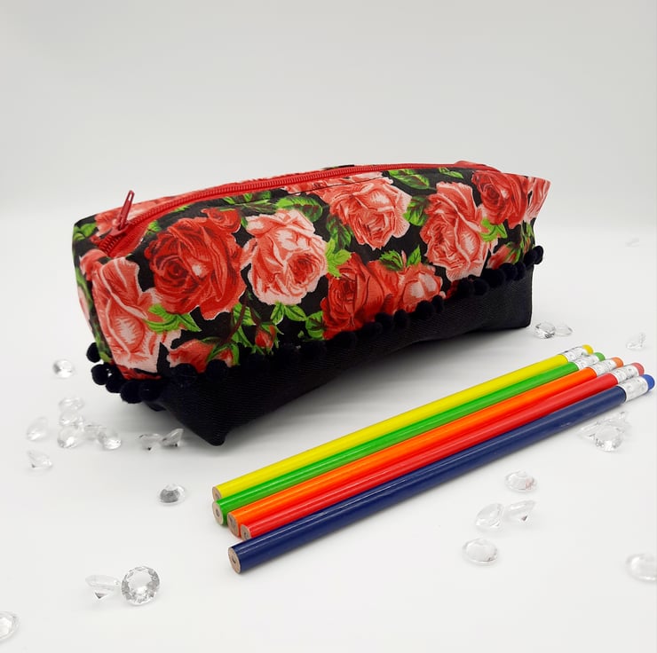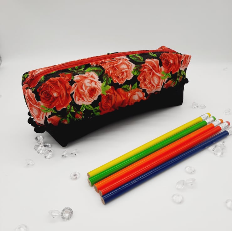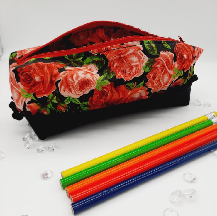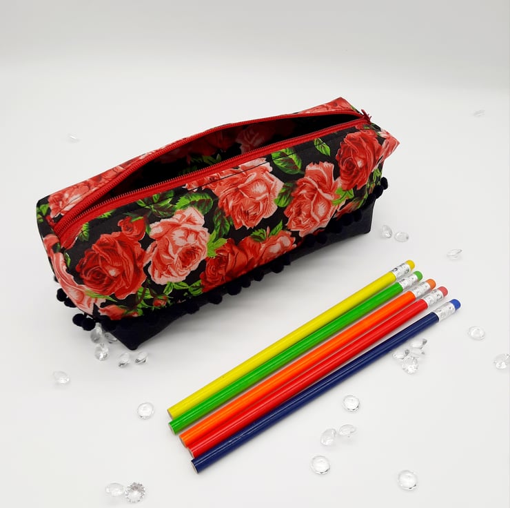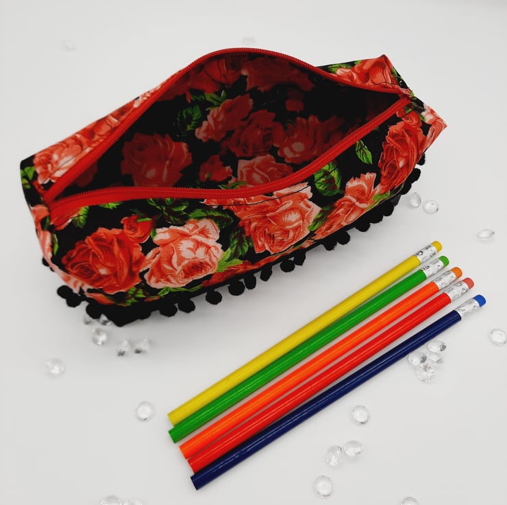 This pencil case is lined with the same outer Red rose cotton print fabric.