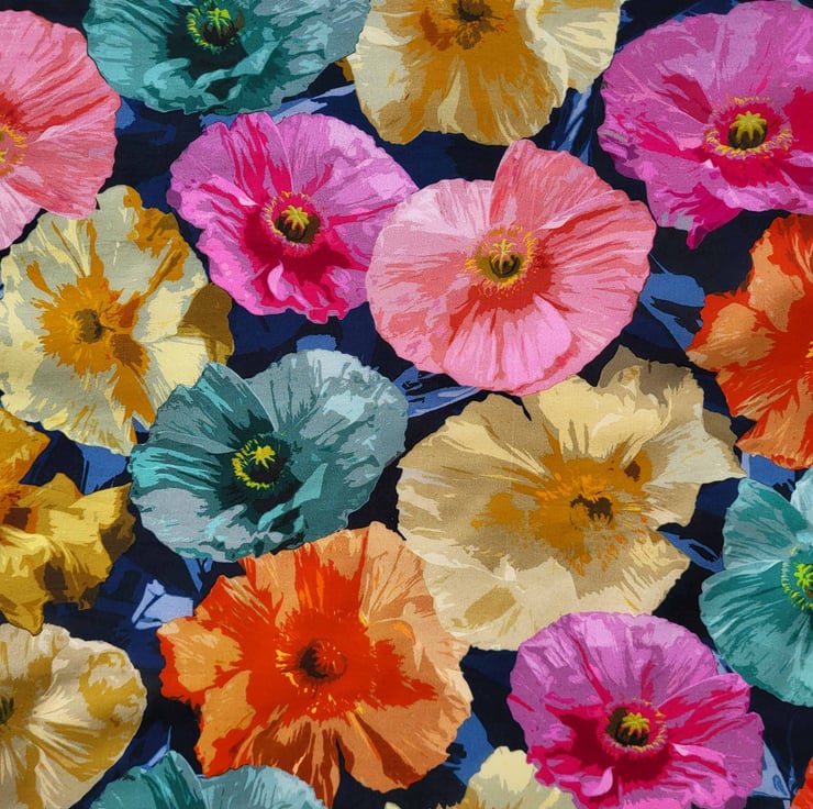 Poppy Wonder is a multicolored print of large, bold poppies set against a dark background of recycled plastic water bottles The print had its origins in a photograph.