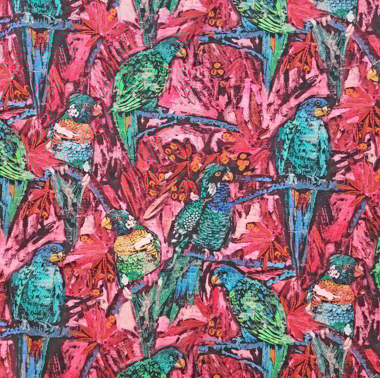 The Sonny James print features colourful parrots perched on tropical branches and brings to mind scarlet macaws. It is based on a series of original artworks created for Liberty in 1987.