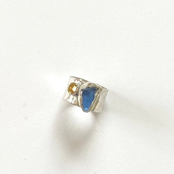 A beautiful rippling sea glass ring with a sandy yellow colour citrine gemstone. Each ring made is one-of-a-kind piece of jewellery. Handcrafted with 10mm wide eco friendly sterling silver band. The ring features an eye catching deep blue sea glass sourced from the shores of North Devon. The silver is finished with a hammered finish.