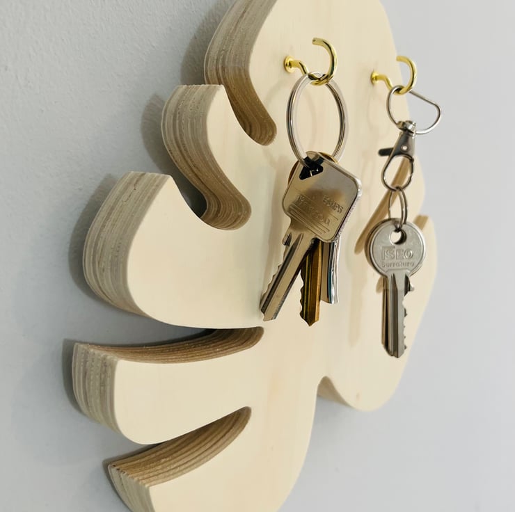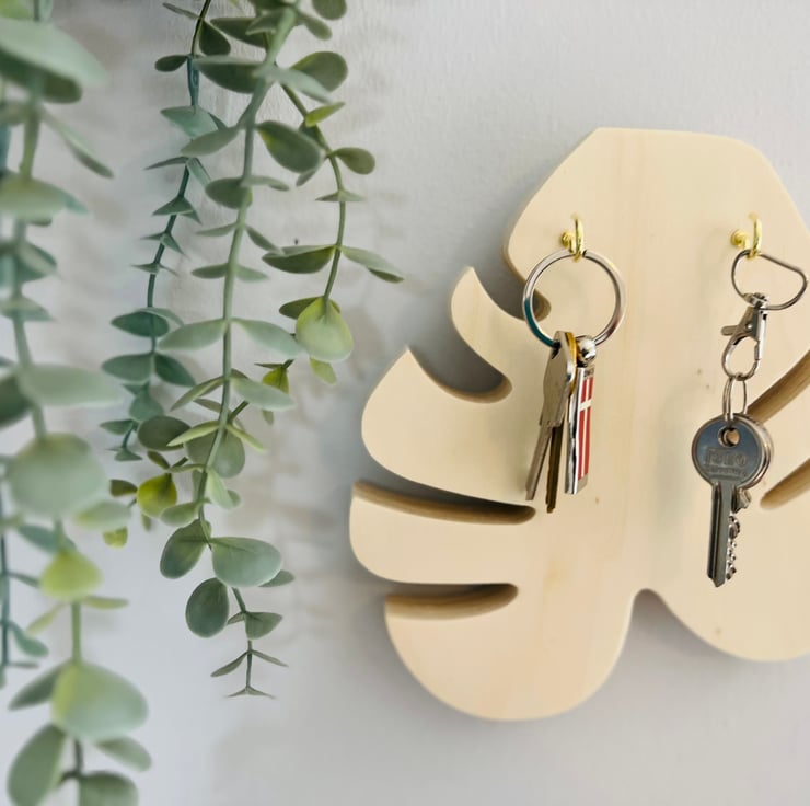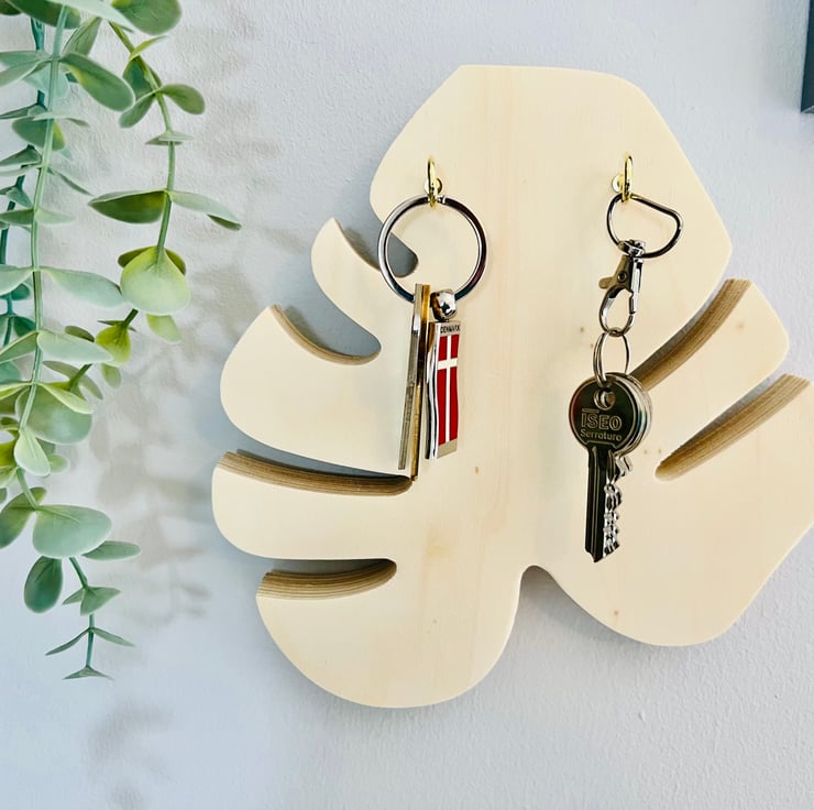 The key holder is made of wood and metal and has a natural wood finish. It measures 20 x 20 cm and 1.8 cm in depth, approx. This key holder is designed to accommodate two to four keys (please request the number of hooks) and is perfect for wall mounting. Its Scandinavian-inspired design is ideal for those who want to add a touch of boho chic to their home decor.
