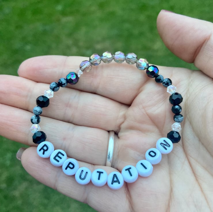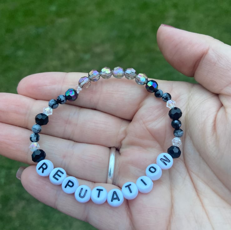 A handmade Dalmatian jasper & bead elasticated bracelet reputation era theme. Handmade by myself a fellow swiftie and crystal lover. This is a perfect treat for yourself or as a gift for a fellow swiftie.