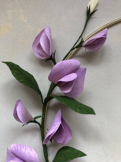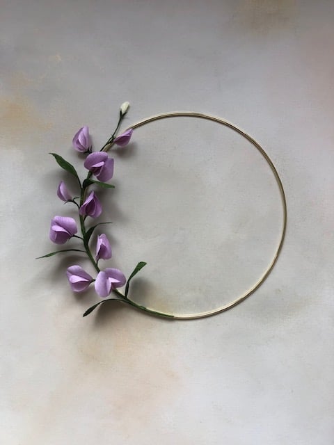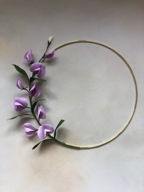 Add a pop of pretty lilac to your wall with this decorative wall hoop adorned with paper sweet peas. The flowers and leaves are hand crafted from the highest quality, FSC-certified crepe paper hand painted with lightfast, artist-grade paint and pastels. A lovely gift for a birthday or anniversary, or perfect for a wedding or for displaying in your home. Can be made in colours of your choice - please feel free to message me to discuss.