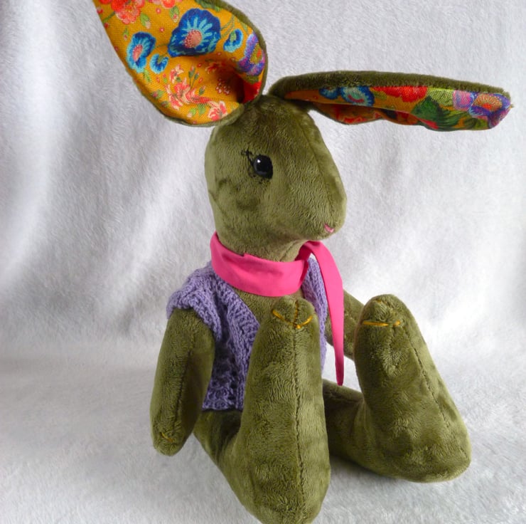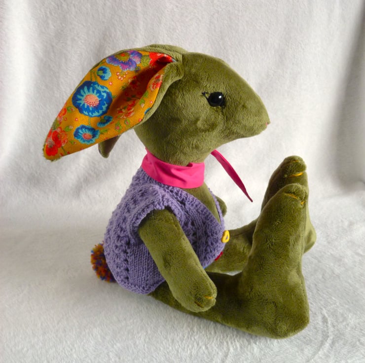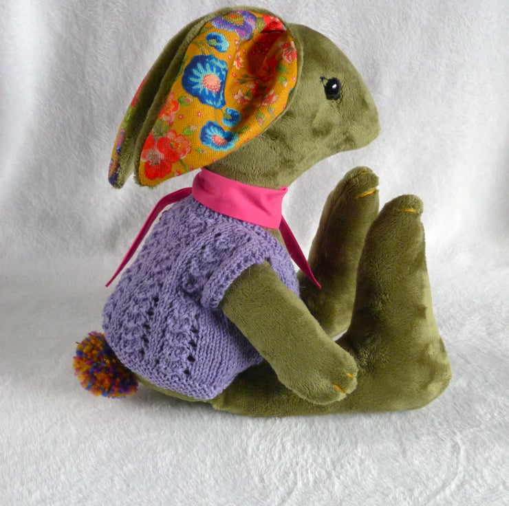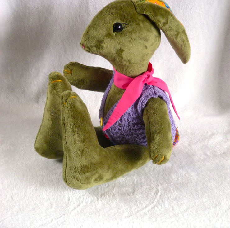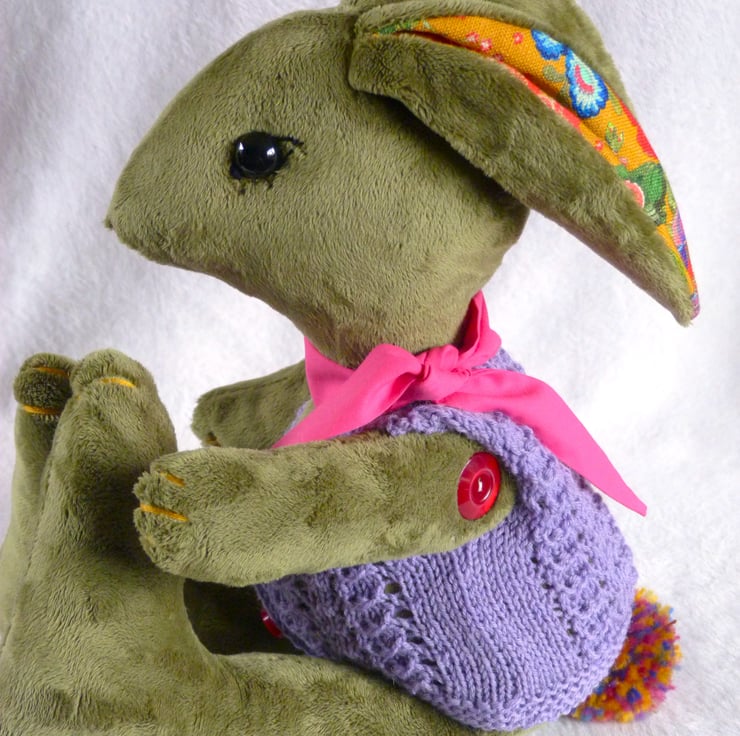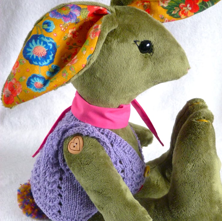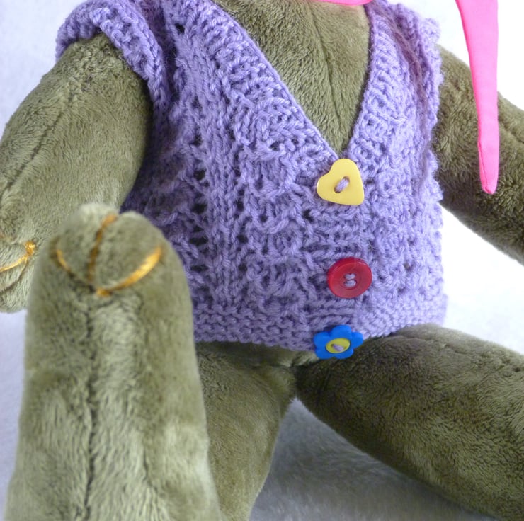 This is a rabbit who is not scared of mixing colours with a pink neckerchief and purple knitted wool waistcoat which has a variety of buttons. The outfit does coordinate with her ears, as do the stitched claws.