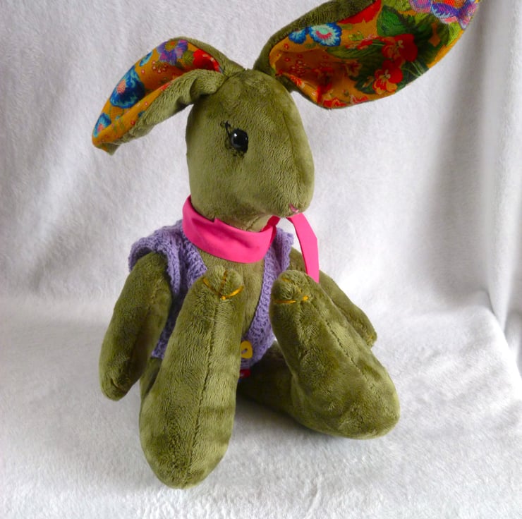 Fern is a fun loving 16" (21" to the top of her ears) unjointed rabbit.. She has been made from a green plush fabric with beautiful floral linen ears.