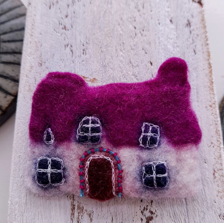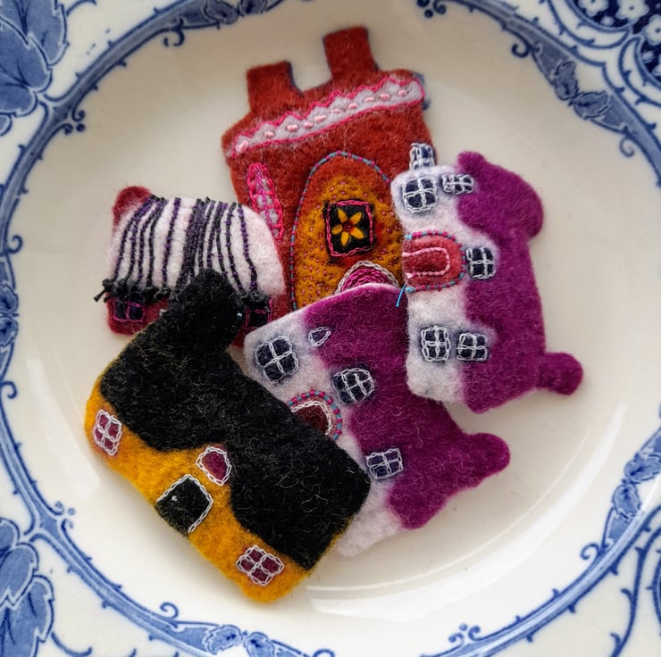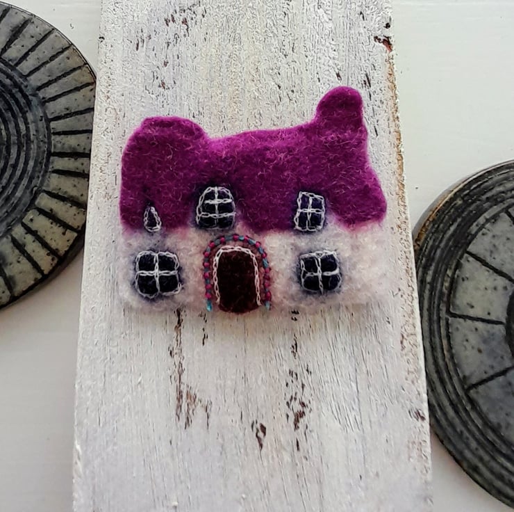 These brooches are made by wet felting, hand stitching, and sometimes applique is added . It takes several hours to make each one and I use vintage textiles and recycle textiles when using applique. The brooch backs are sewn in and are made from either silver plate or gold plate. The brooches are backed with machine made felt to give more strength.