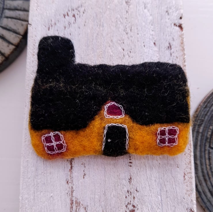 These brooches are made by wet felting, hand stitching, and sometimes applique is added . It takes several hours to make each one and I use vintage textiles and recycle textiles when using applique. The brooch backs are sewn in and are made from either silver plate or gold plate. The brooches are backed with machine made felt to give more strength.