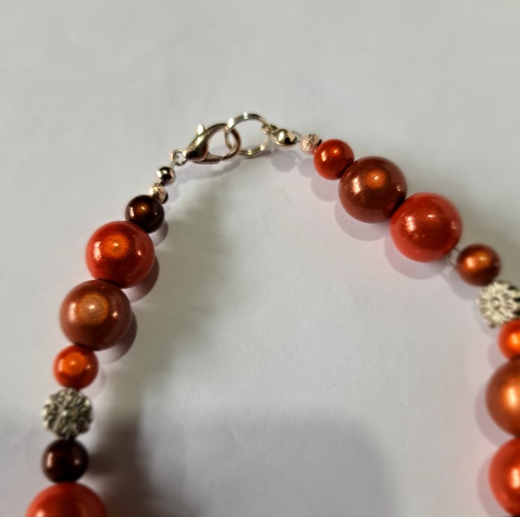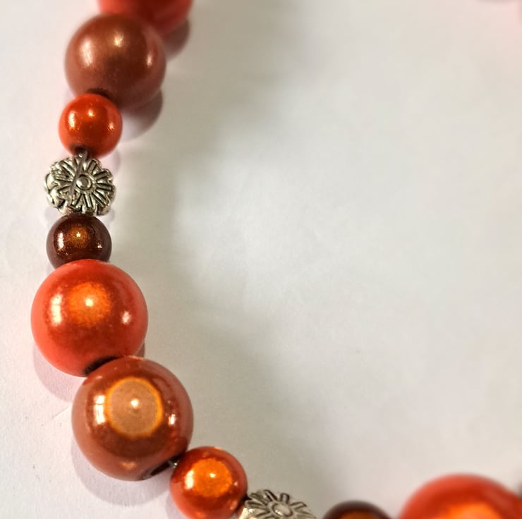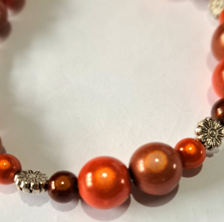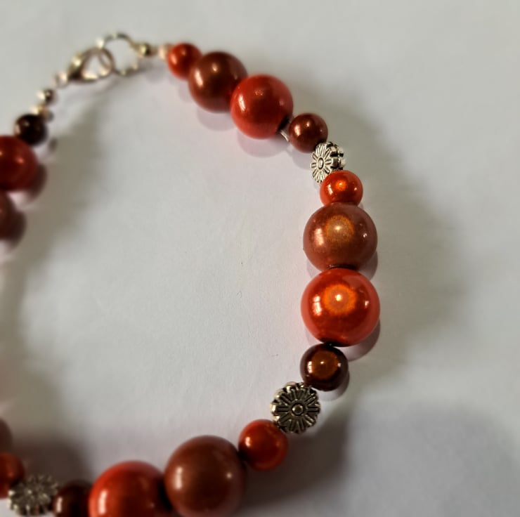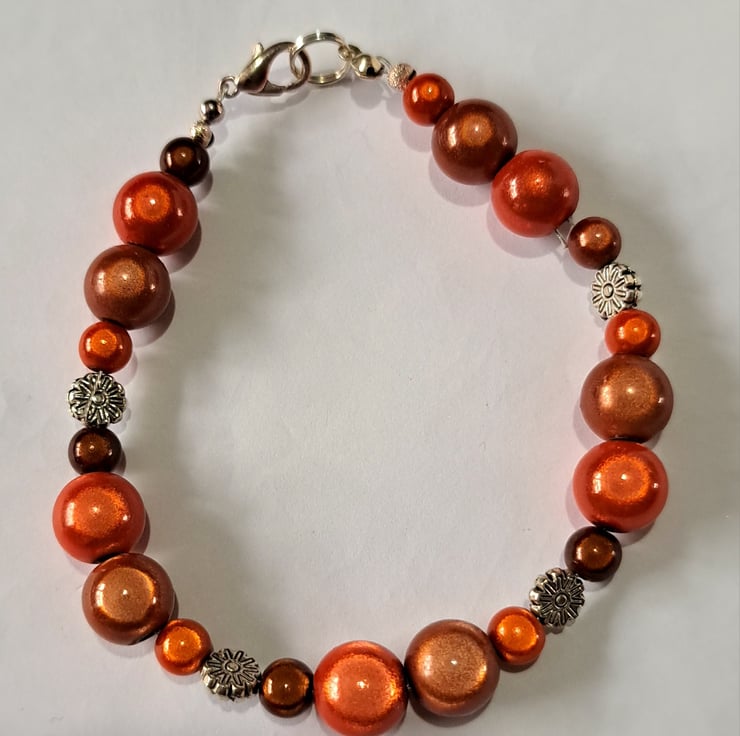 Lovely wired disco beaded bracelet. Silver spacers, brown, orange and black disco beads and a lobster clasp. These beads give a cat's eye light when in a certain light.