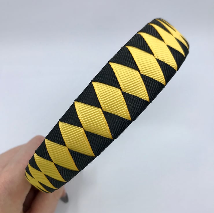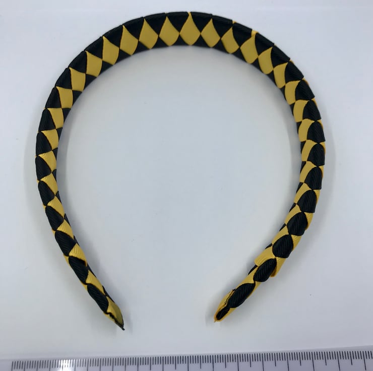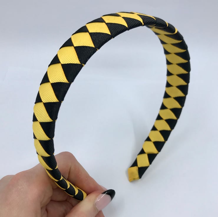 Our Diamond pleated hairbands are handmade here in our little shop. They are so cute the could compliment any school Uniform with Black and Yellow Gold in it. They are ideal for keeping those sneaky little curls from straying into your little one's eyes.