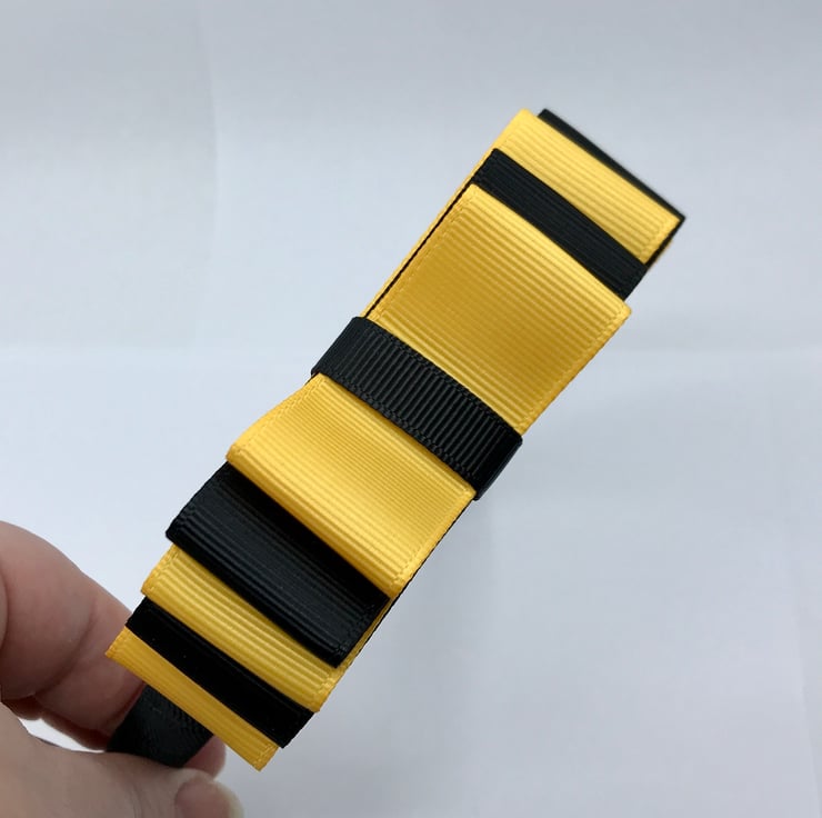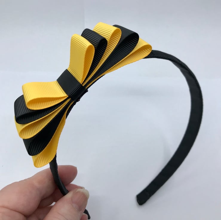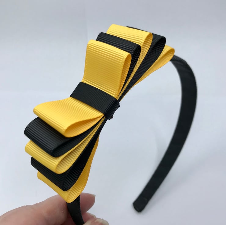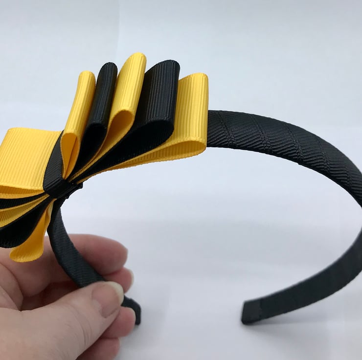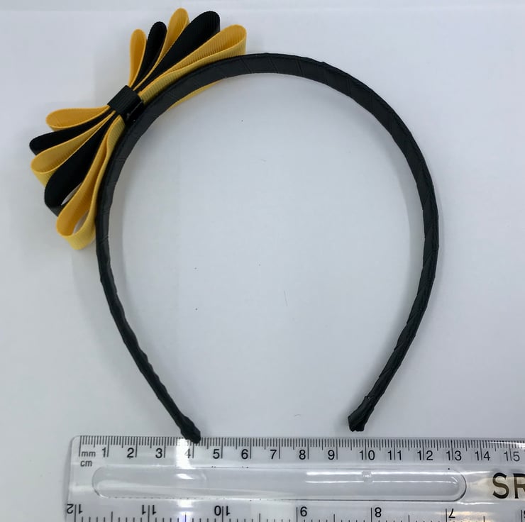 Our hairbands are handmade here in our little shop. They are so cute the could compliment any school Uniform with Black and Yellow Gold in it. They are ideal for keeping those sneaky little curls from straying into your little one's eyes.
