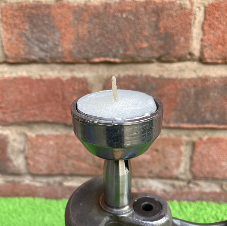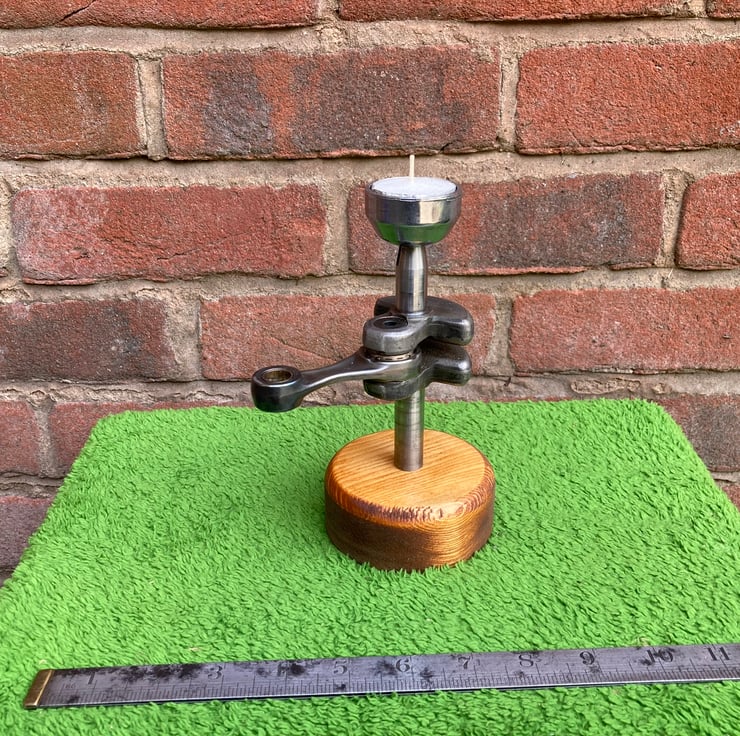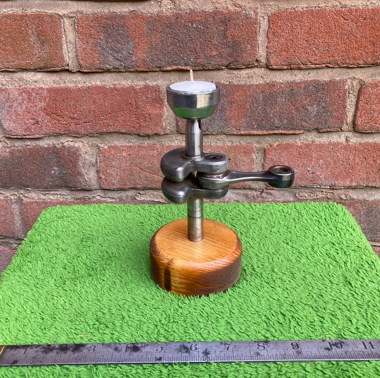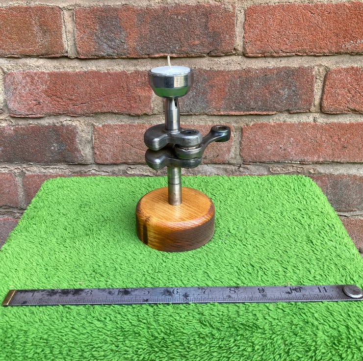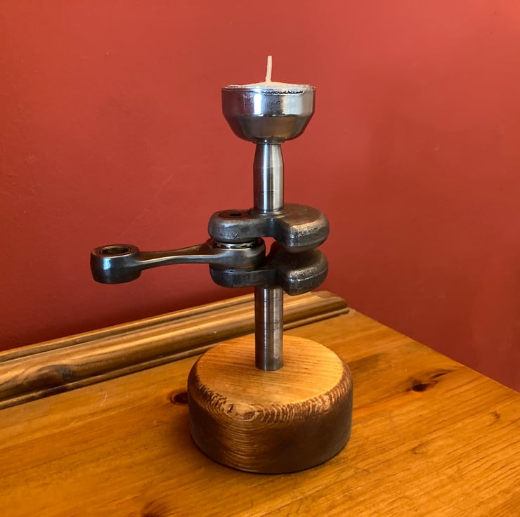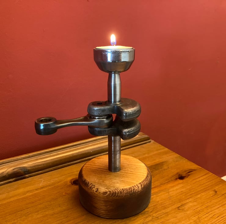 A novel and quirky industrial/automotive themed tea light candle holder. It is made from a chainsaw crankshaft with the connecting rod still in place as the upright, with a machined-out pull start ratchet forming a cup to hold a 40mm tea light. The candle is a drop fit onto the cup, enabling easy removal to change it.