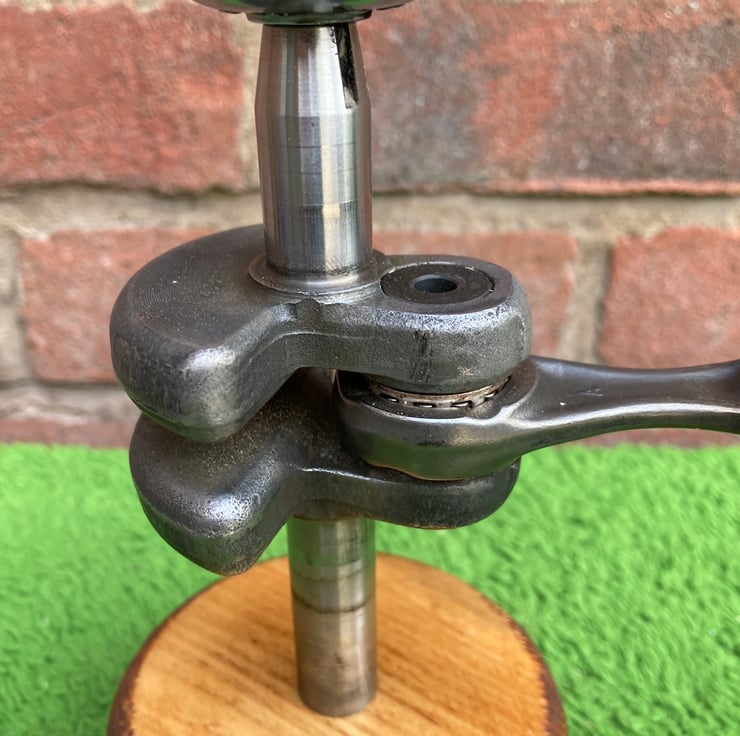 The crankshaft is screwed into a Danish oiled base made from reclaimed scaffold plank to give the holder stability.