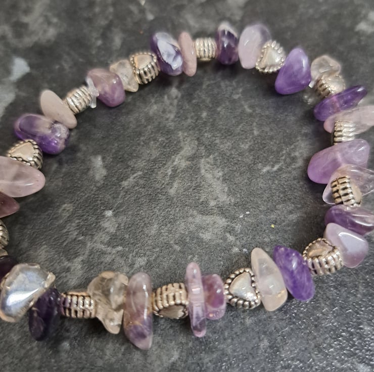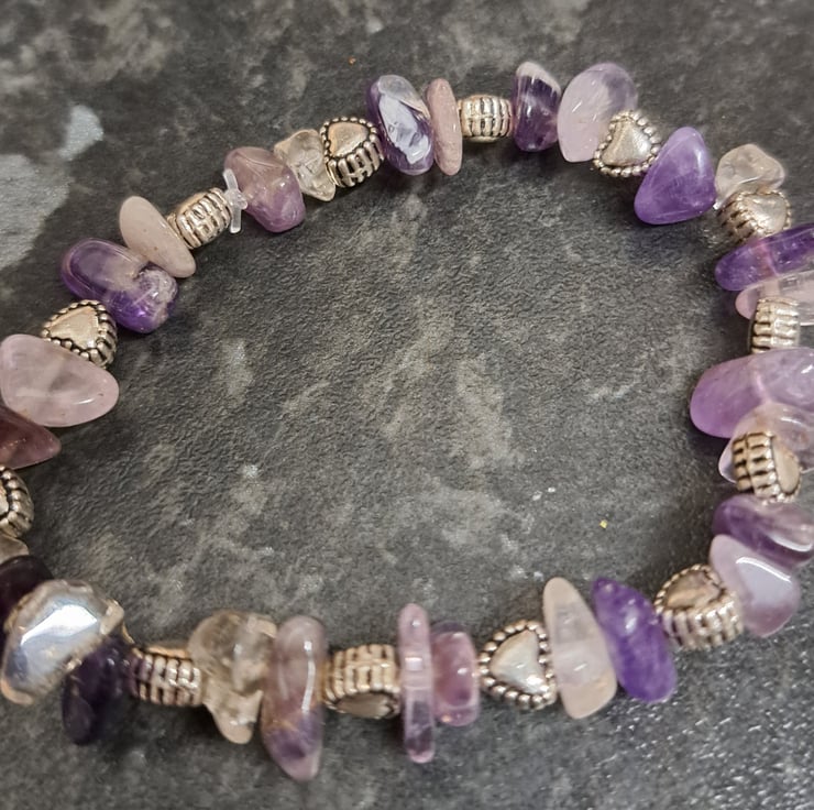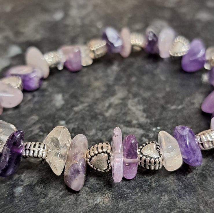 Amethyst crystal elasticated bracelet with heart silver spacers.