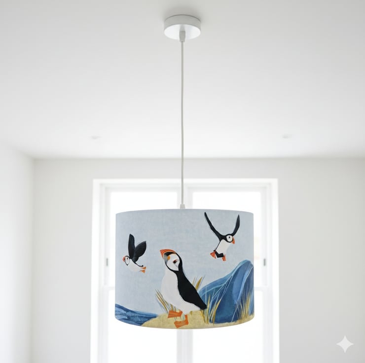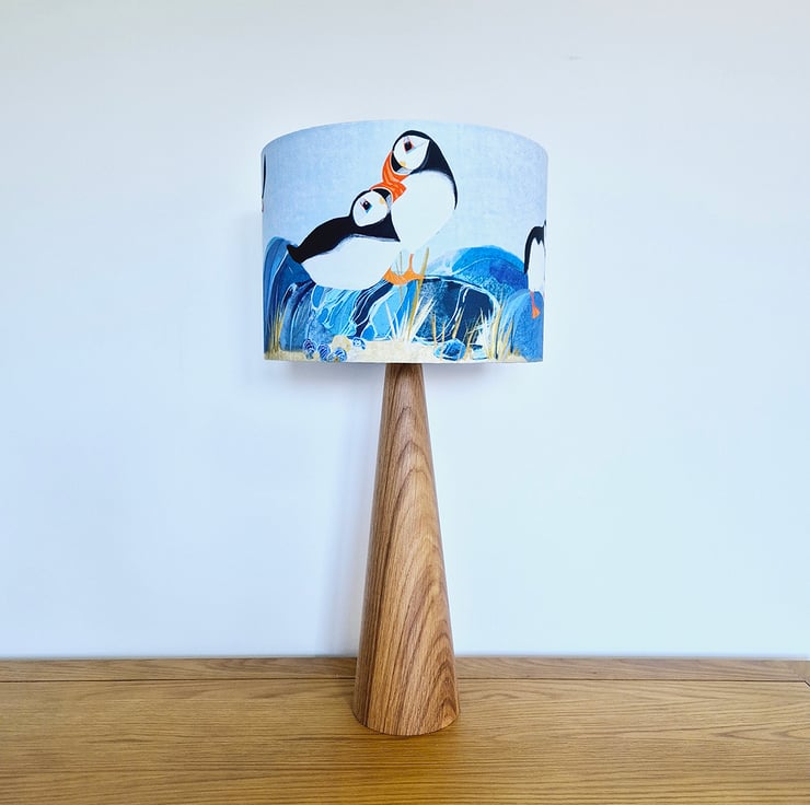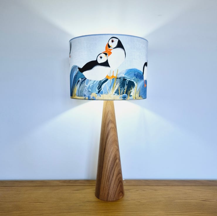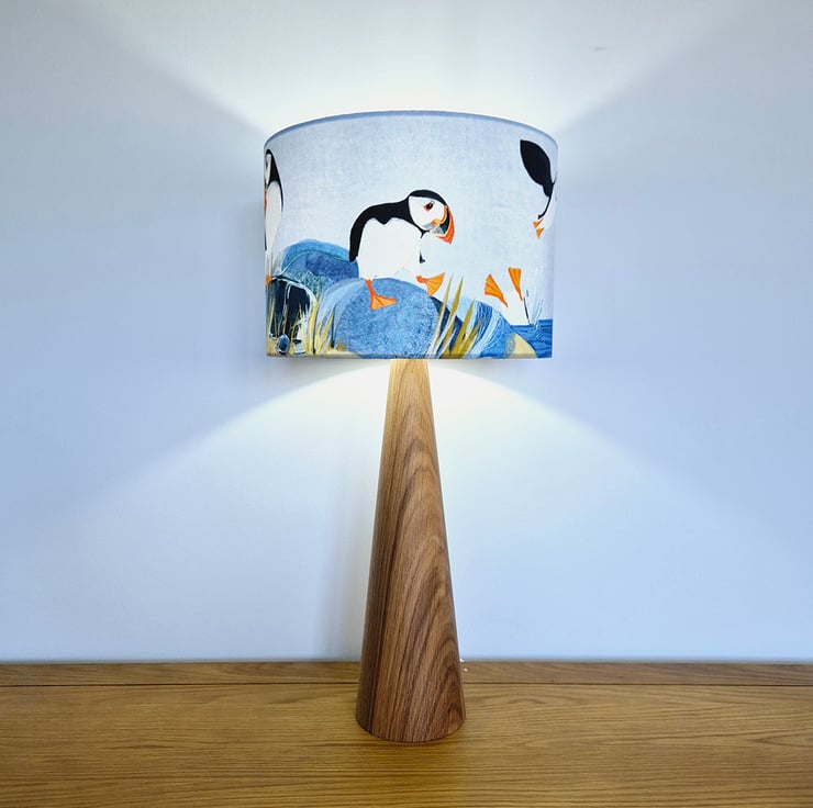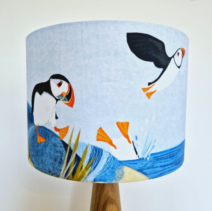 Esk Valley Lampshades is a local company that hand makes lampshades and cushions using textiles printed from original artwork. My last Puffin Lampshade was a great success and I felt my new puffin island artwork would work wonderfully on a shade too.