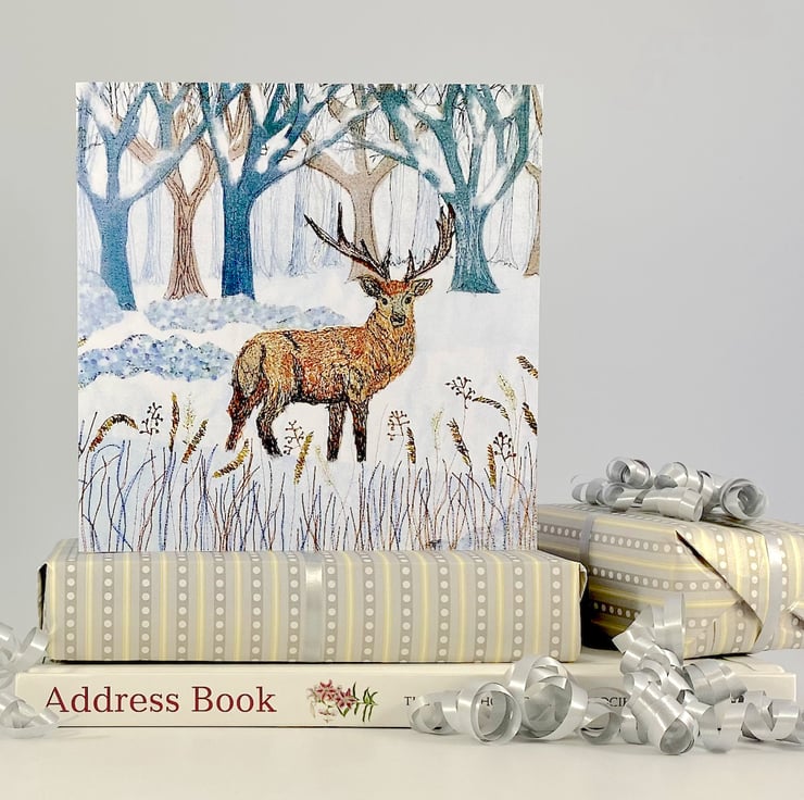 Birthday card perfect for wintry or snowy themes, featuring a reproduction of textile artist Heidi Meier's winter embroidery of a stag emerging from the cover of the frosty woodland.