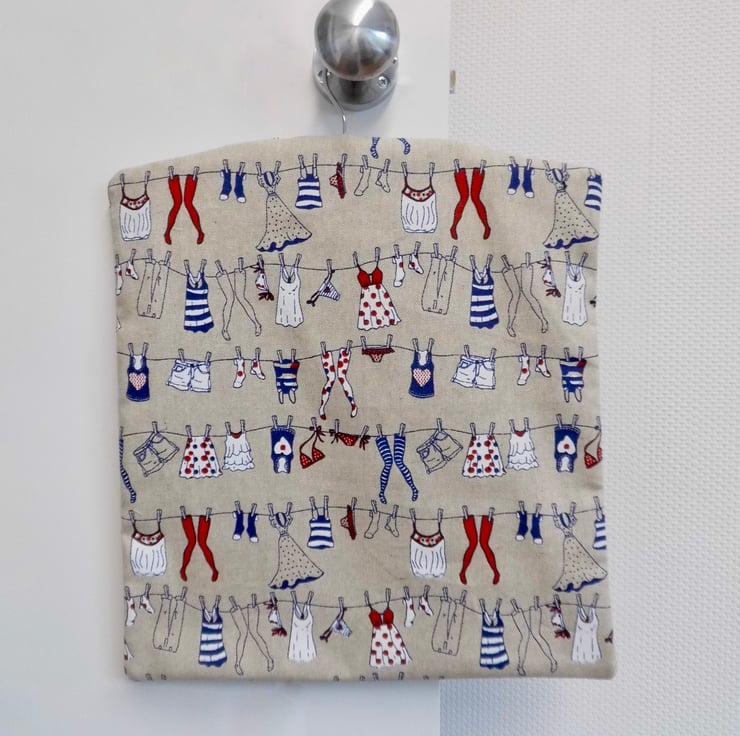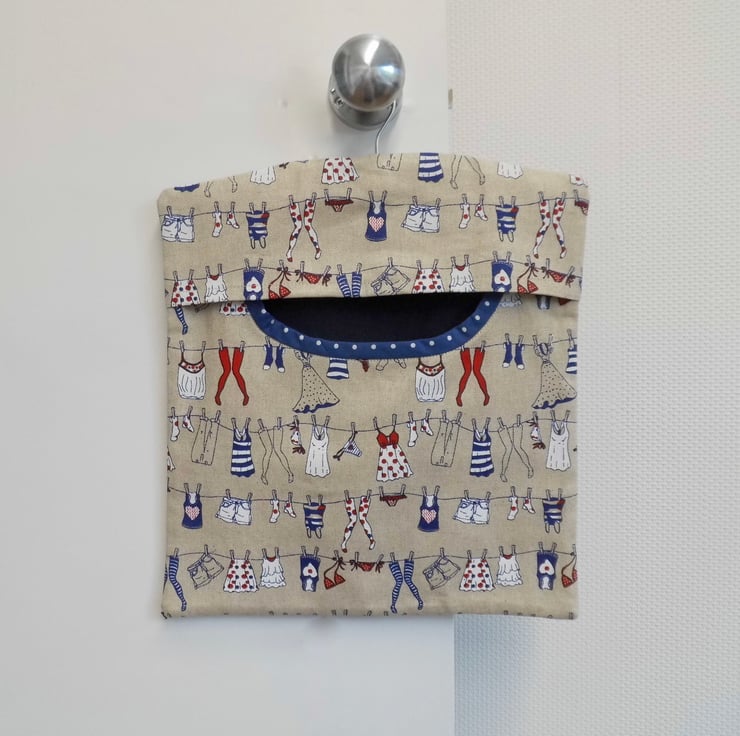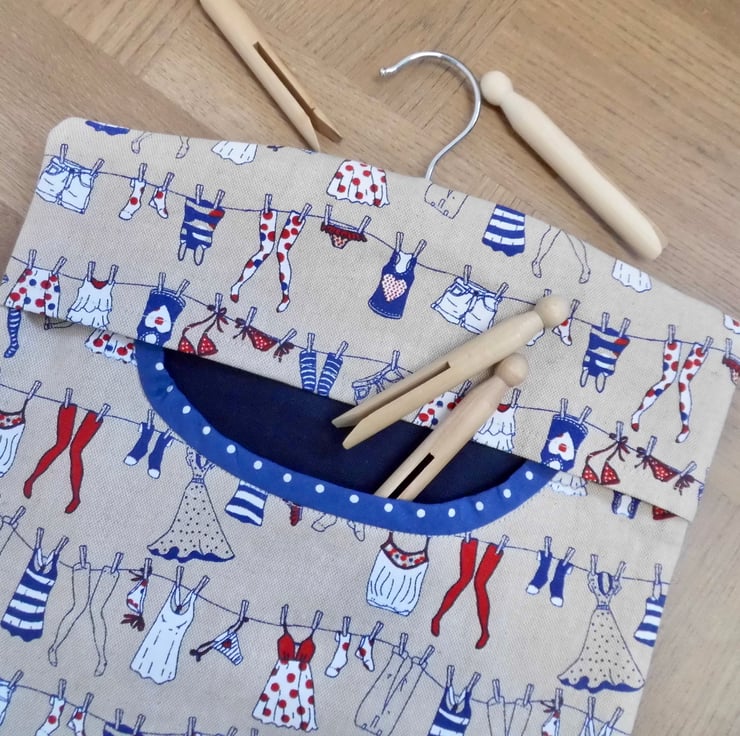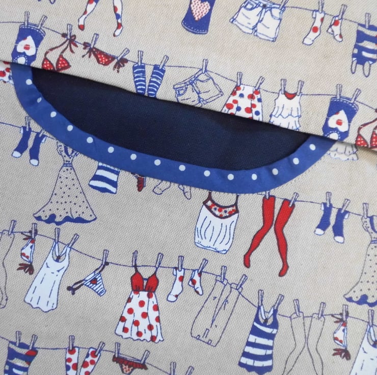 A fully lined peg bag carefully made with a medium weight cotton fabric in a fun washing line print. The back is lined with a navy blue fabric and you can see this through the opening. The front is lined with cream cotton fabric.