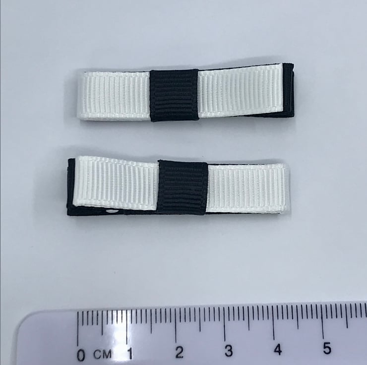 Our Small Straight black and white clips are handmade here in our little shop. They are so cute and compliment any school Uniform with black and white in it. They are ideal for keeping those sneaky little curls from straying into your little one's eyes.