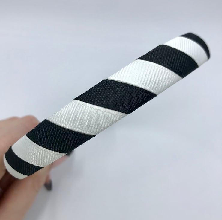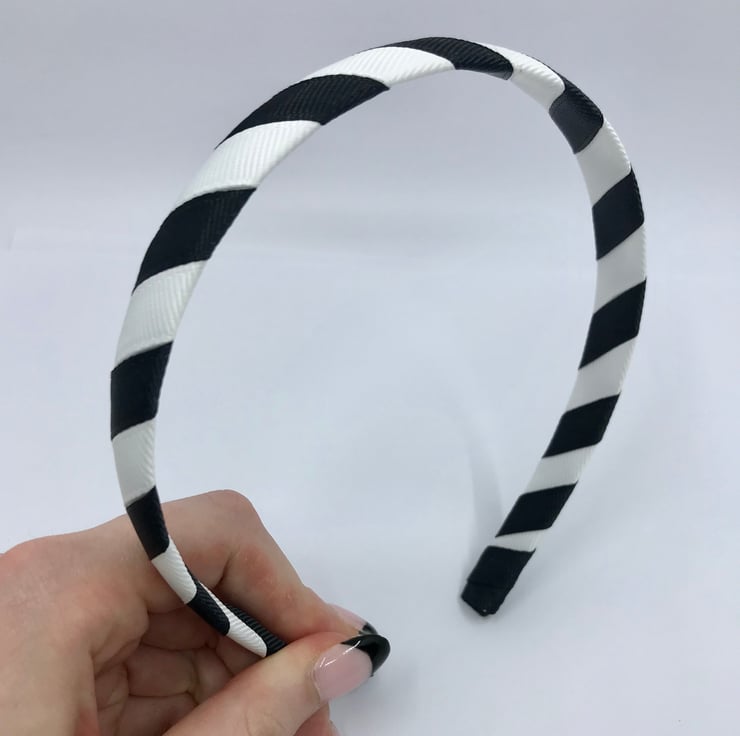 Our Black and White Ribbon 1.8cm striped head band is made with excellent quality grosgrain ribbon. It will match beautifully with your little one's school Uniform and keep those little stray curls out of your little one's eyes.