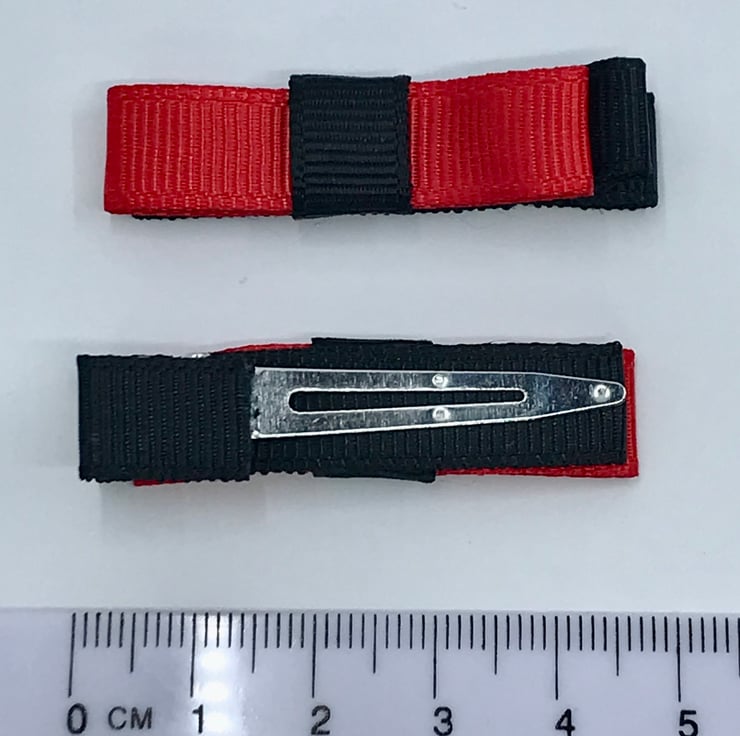 Our Small Straight black and red clips are handmade here in our little shop. They are so cute and compliment any school Uniform with black and red in it. They are ideal for keeping those sneaky little curls from straying into your little one's eyes.