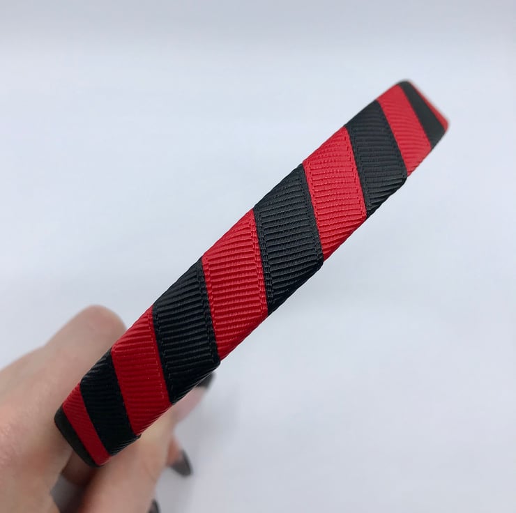 Our Black and Red Ribbon 1.8cm striped head band is made with excellent quality grosgrain ribbon. It will match beautifully with your little one's school Uniform and keep those little stray curls out of your little one's eyes.