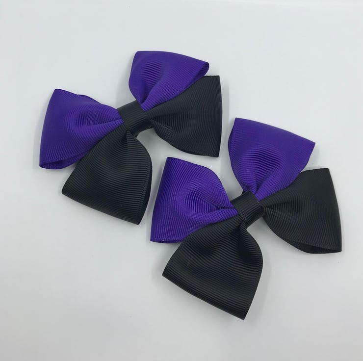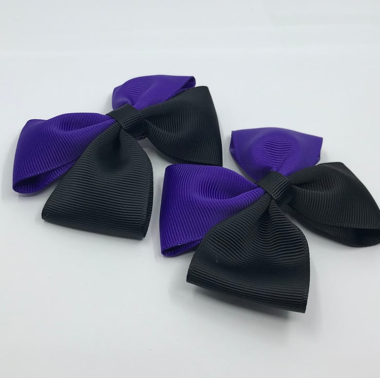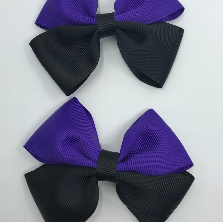Our two tone double bows are handmade here in our little shop. They are made from the best quality Grosgrain ribbon. These bows are simple and classic and look extremely smart and go well with the black and purple School Uniform.