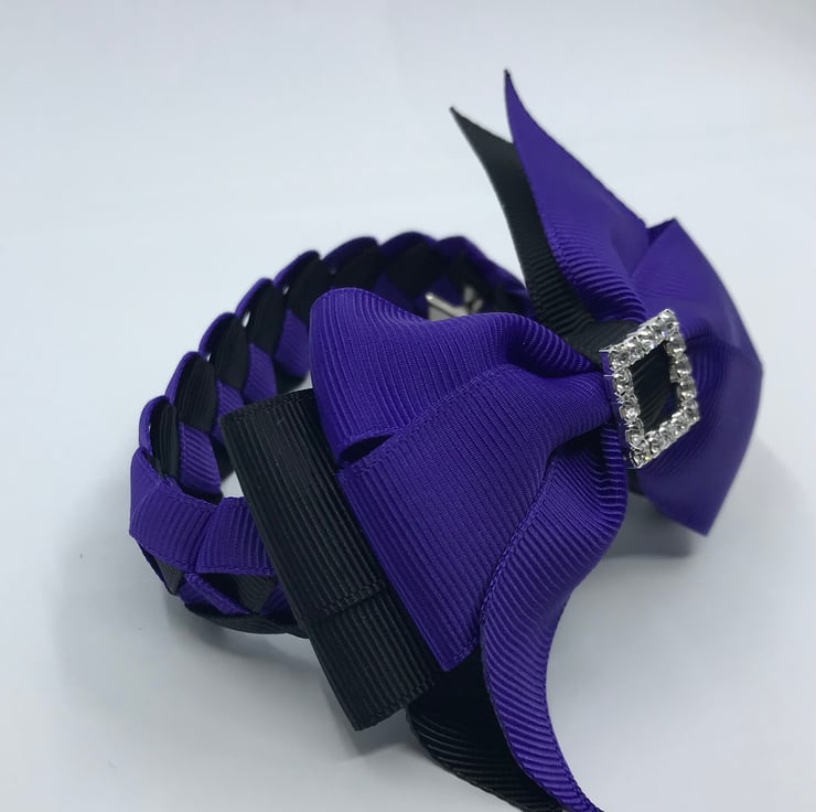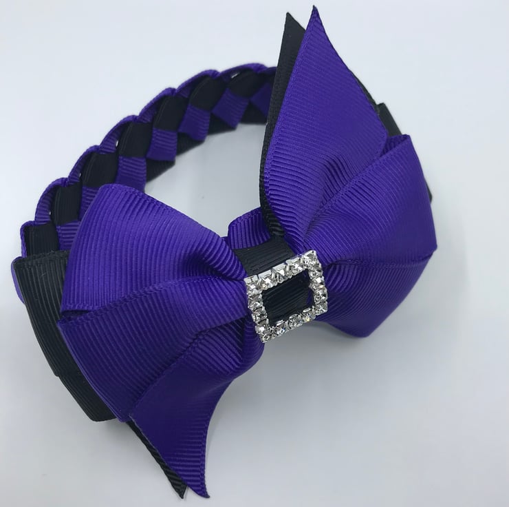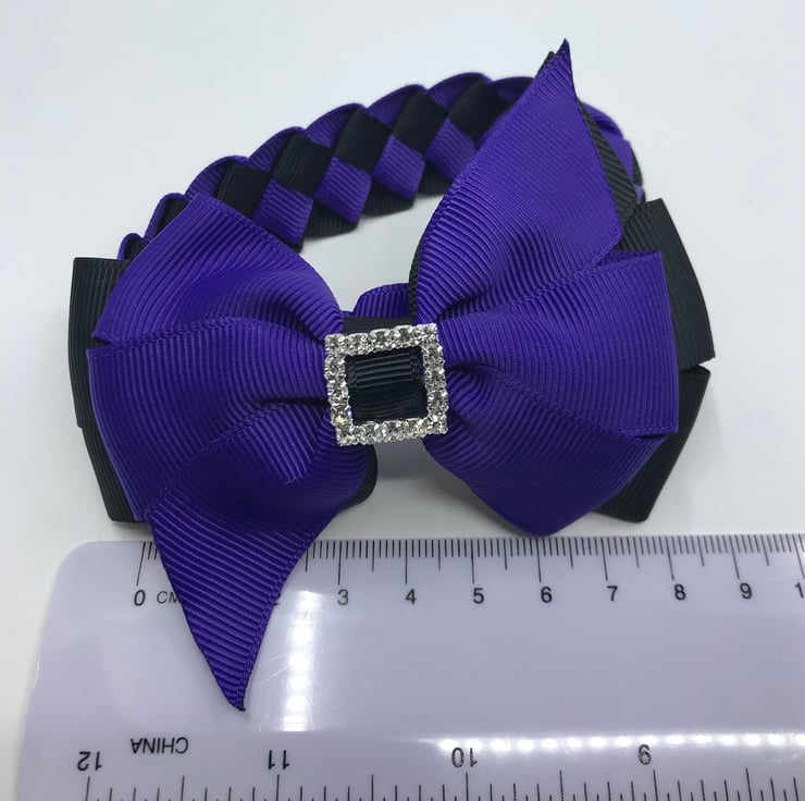 Our black and purple Bunwrap is handmade here in our little shop. It is made from the best quality Grosgrain ribbon. The Bunwrap is really elegant and look extremely smart wrapped around your little one's bun. It clips in at the front of the bun then the tail wraps around the bun and clips beneath the bow at the front to complete the look, tail is 21 cm.