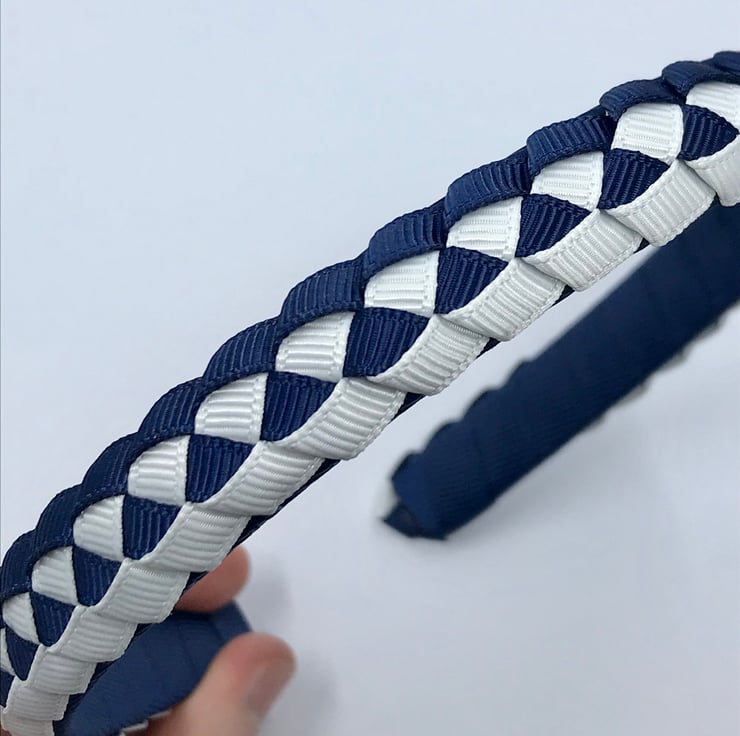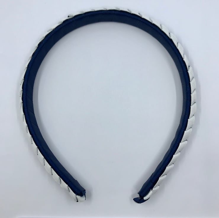 Our pleated hairbands are handmade here in our little shop. They are so cute the could compliment any school Uniform with navy and white in it. They are ideal for keeping those sneaky little curls from straying into your little one's eyes.