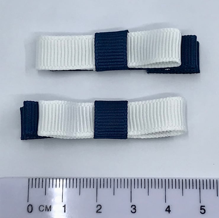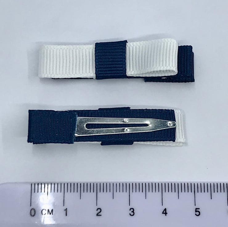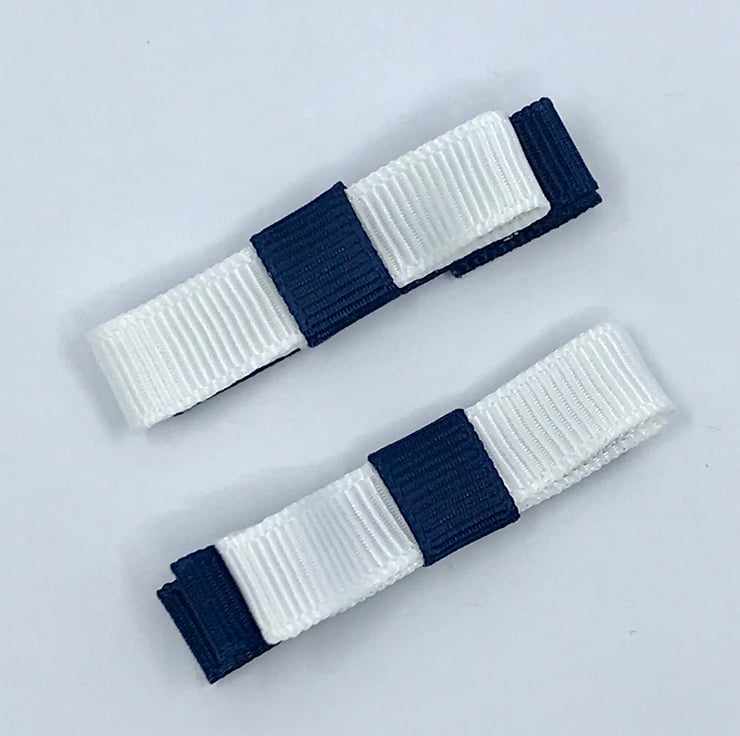 Our Small Straight navy and white clips are handmade here in our little shop. They are so cute and compliment any school Uniform with navy and white in it. They are ideal for keeping those sneaky little curls from straying into your little one's eyes.