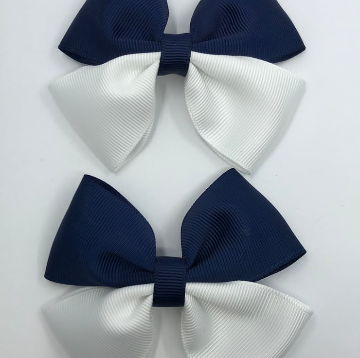 Our two tone double bows are handmade here in our little shop. They are made from the best quality Grosgrain ribbon. These bows are simple and classic and look extremely smart and go well with the navy and white School Uniform.