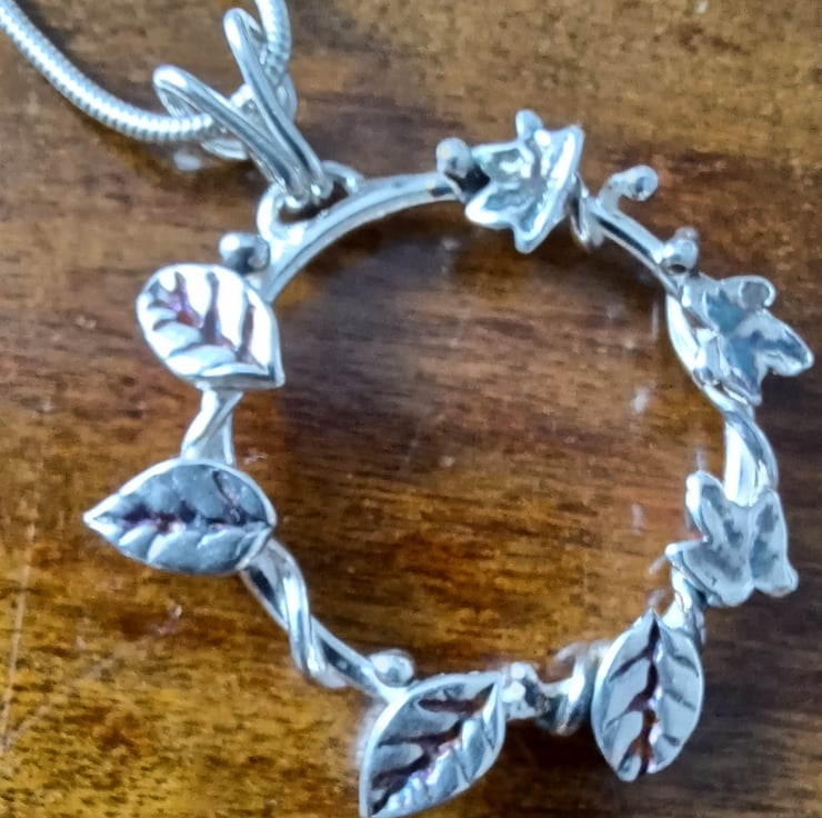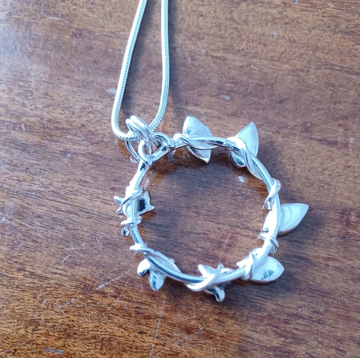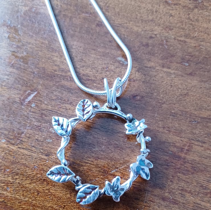 A pretty sterling silver wreath hangs from a sterling silver snake chain. The wreath consists of seven tiny silver leaves arranged around a silver circle base. The wreath is approx 3cm in diameter. It hangs from the chain by a handmade sterling silver bail. The chain is 18" long and it is fastened with a sterling silver lobster clasp.