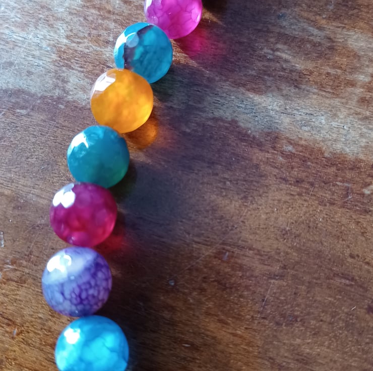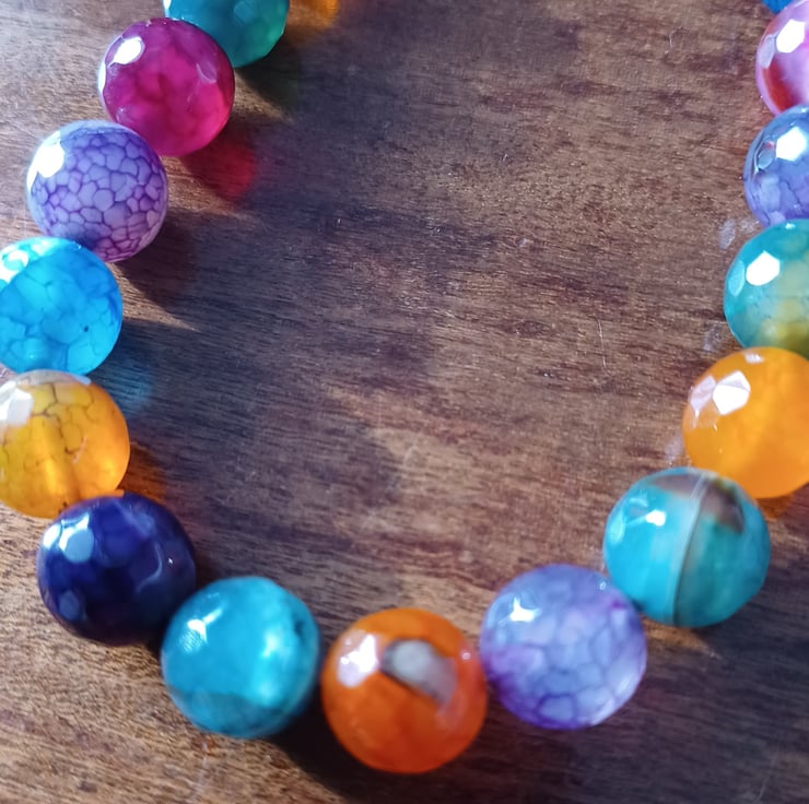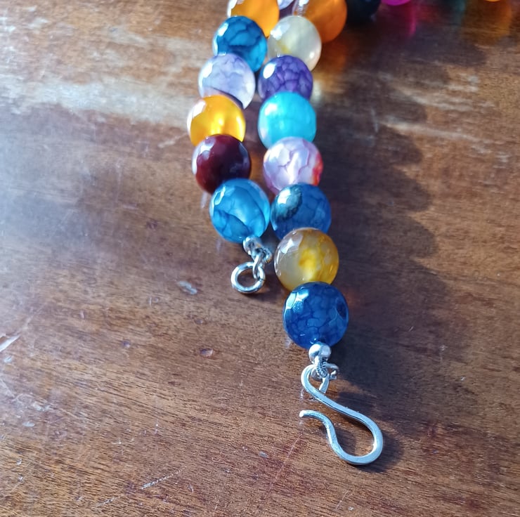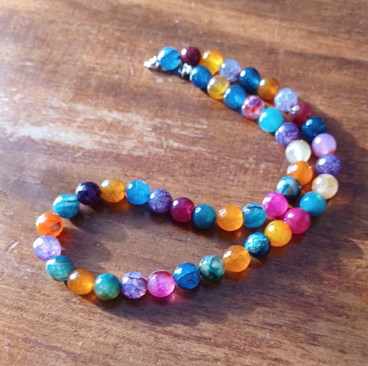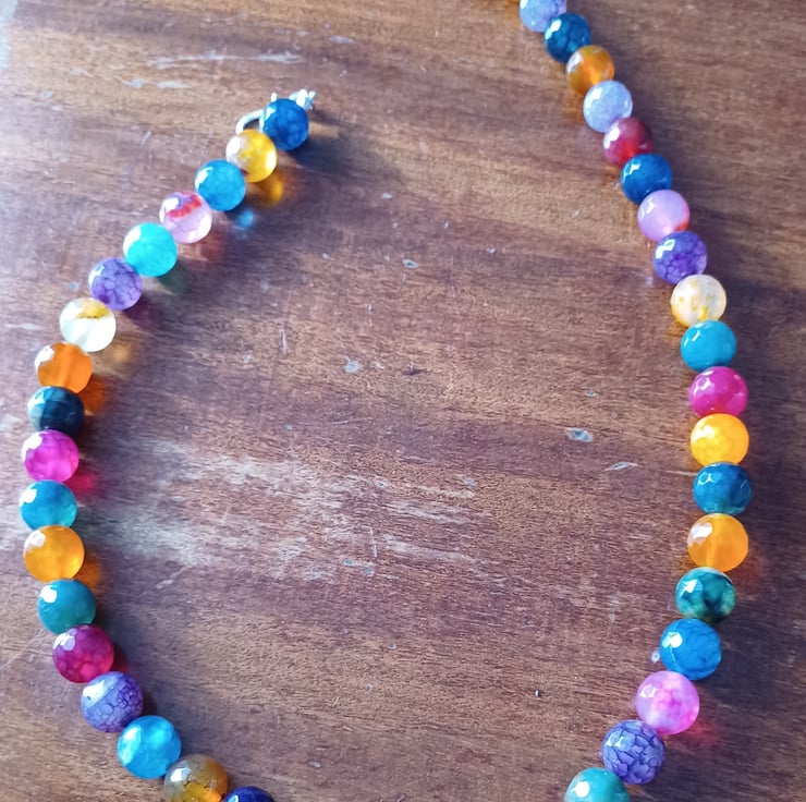 No more hunting through the jewellery box to find something to match your outfit. This elegant necklace with its multicoloured faceted dragon vein agate beads will match all your clothes! The beads are 10mm in diameter. The necklace is 46cm long and finished with a handmade sterling silver hook clasp.