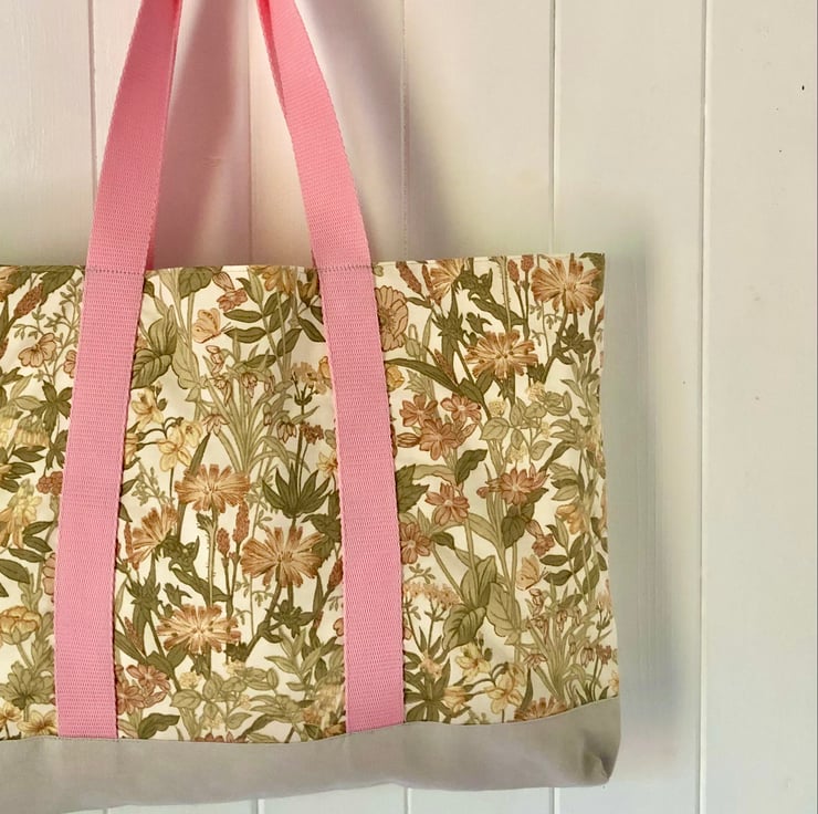 Beautiful floral tote/shopping bag. Made from repurposed fabrics: part of a shirt, pillowcase and secondhand fabric with new webbing for the handles.