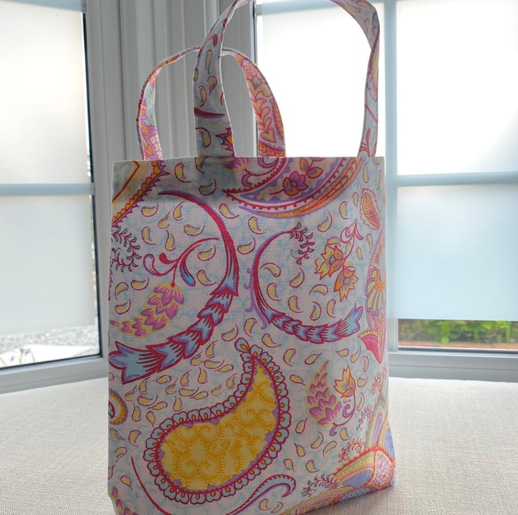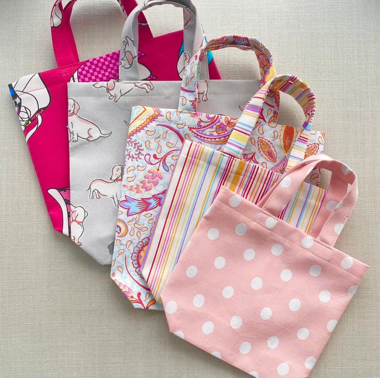 Tote style gift bags with boxed corners and handy ribbon tie for concealing gifts within. These bags are upcycled from pre loved home linens and soft furnishings. Mostly cotton/polyester mix fabric strengthened with fusible interfacing they are perfect for gift giving or storing lightweight items such as hair accessories. If you would like a bag for heavy use, eg. as a shopping bag, please see my lined tote bags or get in touch with your ideas. Lovingly wrapped and sent in recyclable or reusable packaging.