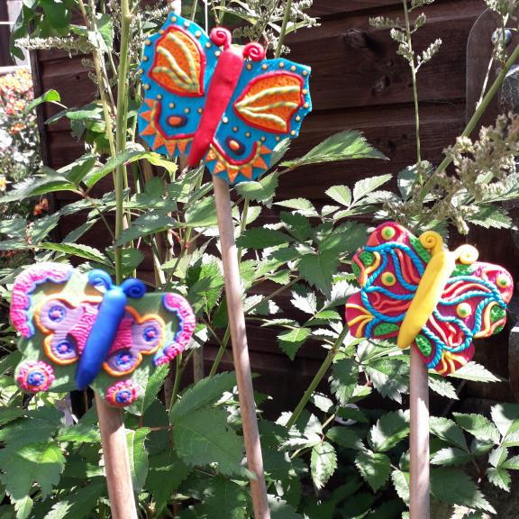 Another set of three colourful garden cane toppers, made from polymer clay, they are not varnished as the clay is waterproof and quite durable outside.