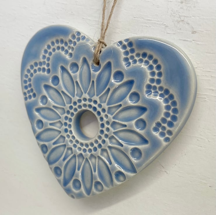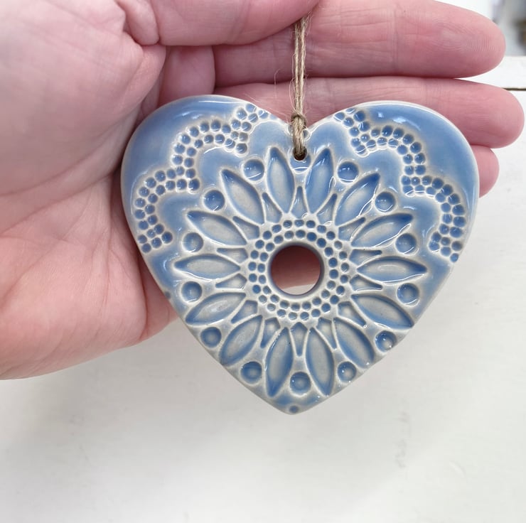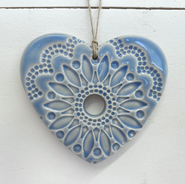 This listing is for a ceramic heart decoration. It is made from white earthenware clay, imprinted with pattern and finished with a bright, glossy glaze. It has been fired twice, once to the bisque stage and then a second firing for the glaze. It measures 7.5 centimetres wide and the same in height x 5mm thick. It can be hung outside.