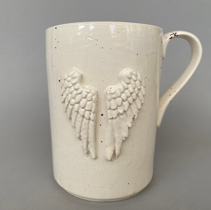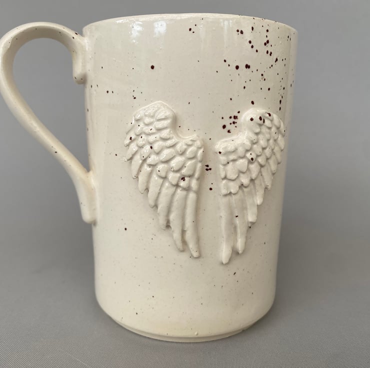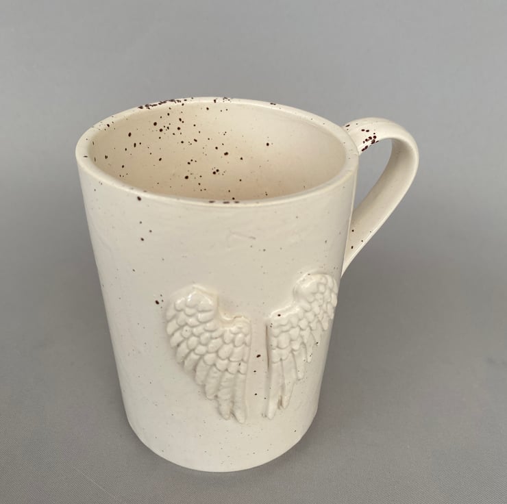 Beautiful white speckled glaze on Angel wings that are on both sides of the mug.