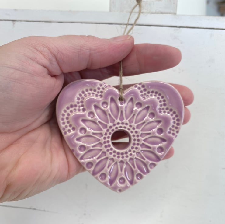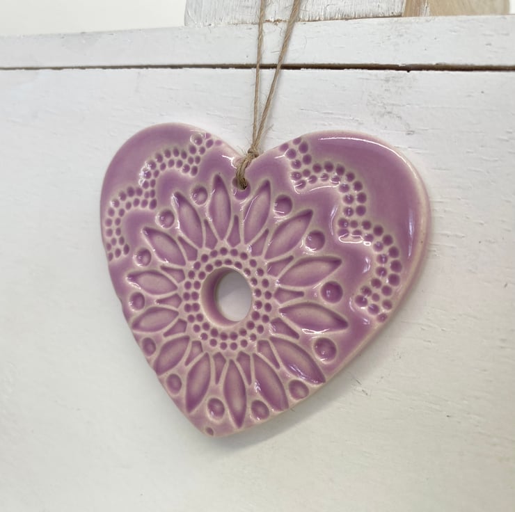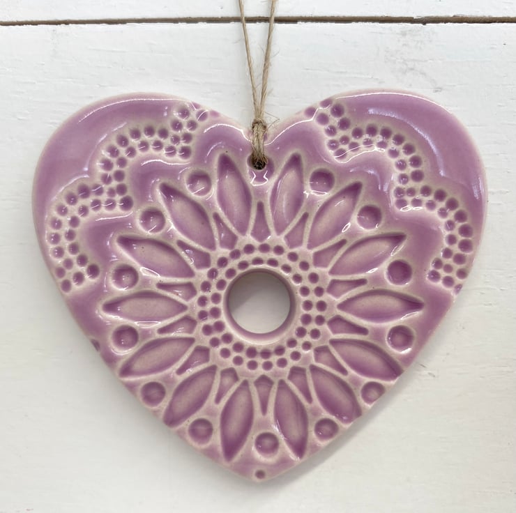 This listing is for a ceramic heart decoration. It is made from white earthenware clay, imprinted with pattern and finished with a bright, glossy glaze. It has been fired twice, once to the bisque stage and then a second firing for the glaze. It measures 7.5 centimetres wide and the same in height x 5mm thick. It can be hung outside.