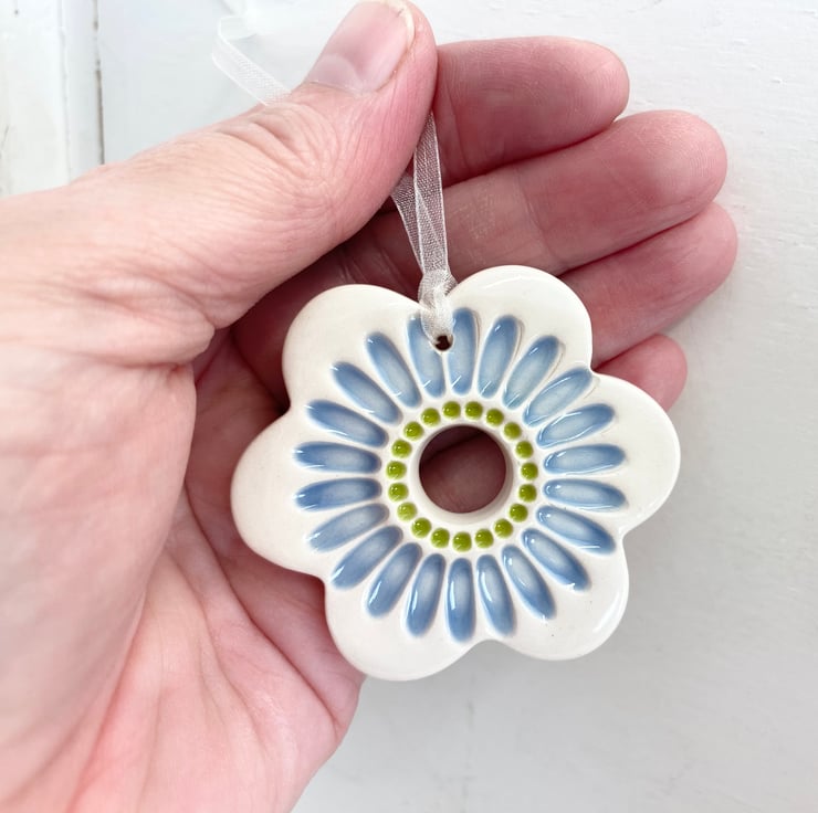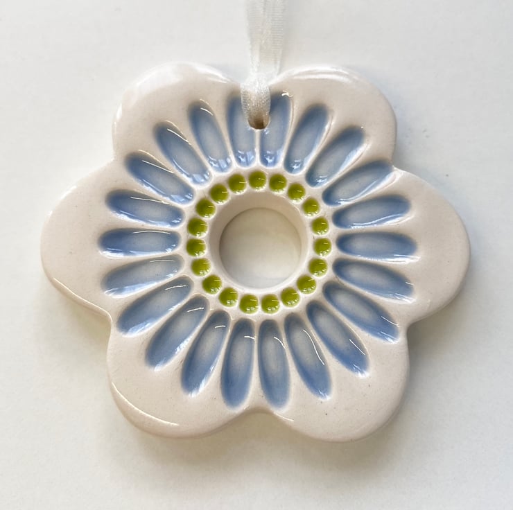This flower decoration is made from white earthenware clay and imprinted with bright pattern. It has been fired twice, once to the bisque stage and then a second firing for the clear glaze. It measures 6 centimetres wide x 5cm height x 5mm thick and hangs from a cream organza ribbon.