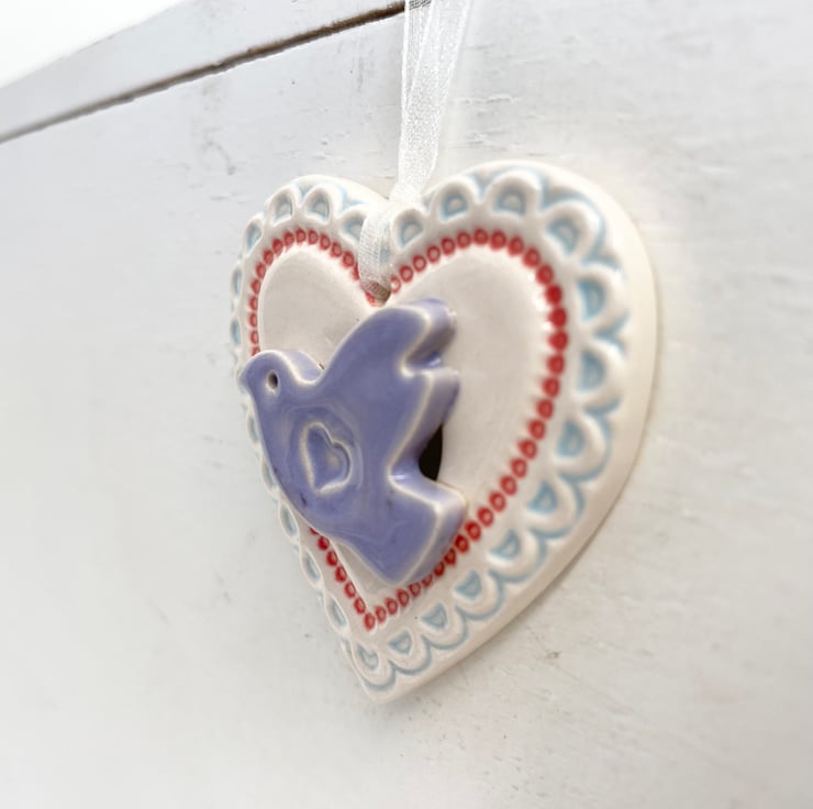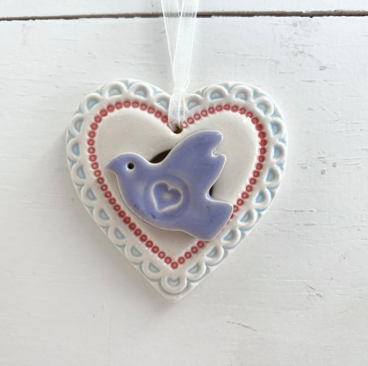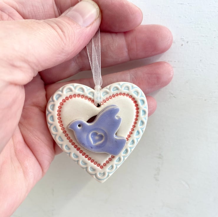 This little heart decoration is made from white earthenware clay and finshed with a little pottery bird. It has been fired twice and finished with a glossy glaze for a lovely smooth finish. It measures 4.5 x 5cm x 1cm deep and hangs from an organza ribbon