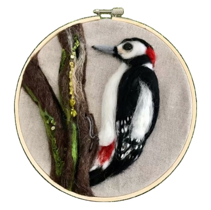 Needle felted woodpecker picture. Felted into linen fabric , this striking garden and woodland bird searches for insects on the branch of a tree .