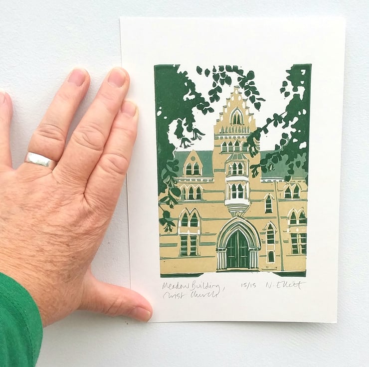 'Meadow Building, Christ Church' - a three colour reduction linoprint in greens and neutral.
