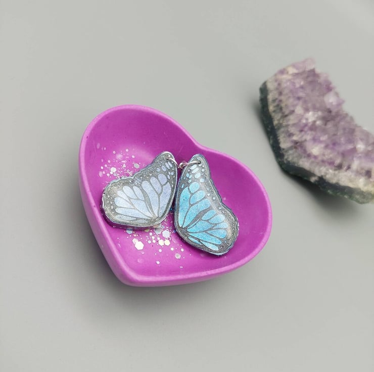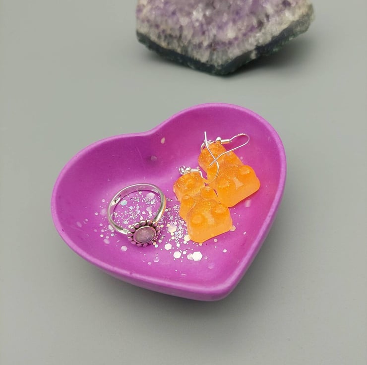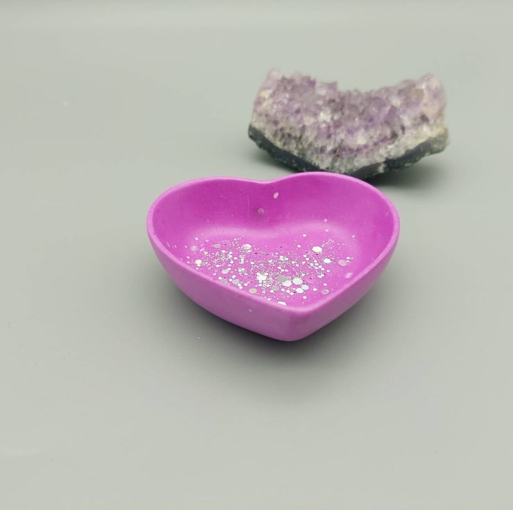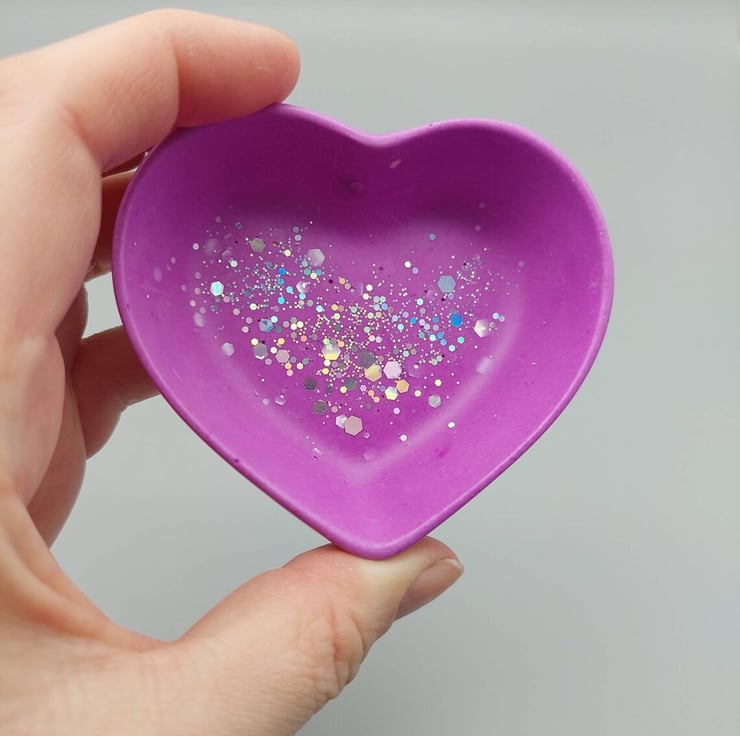 This stunning purple heart jewellery dish is made from Jesmonite, an eco-friendly resin. To get it to be this vibrant shade of purple, I have used some neon purple pigment powder. I also added some holographic glitter flakes into the mould before pouring in the jesmonite so they weren't lost in the mix.