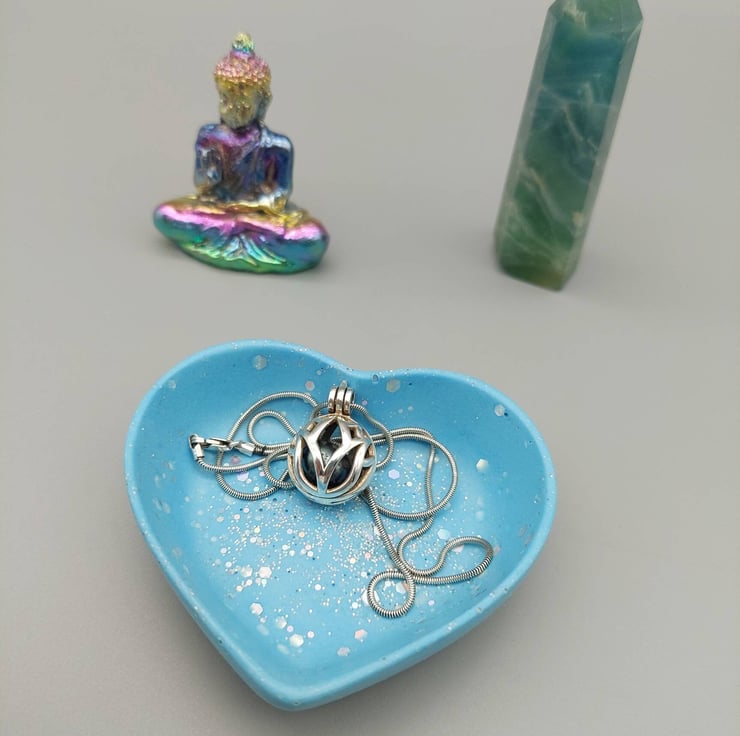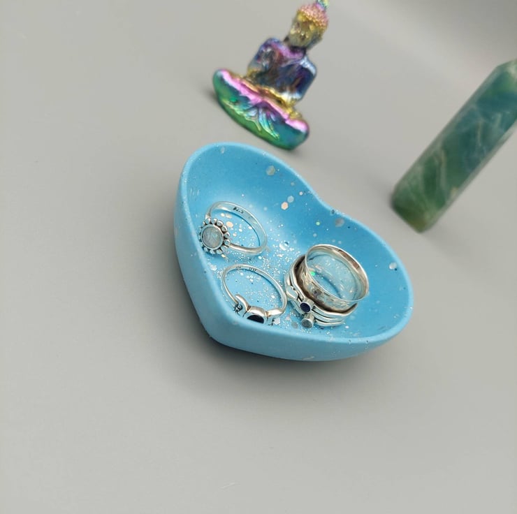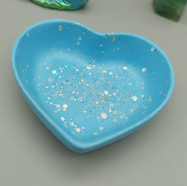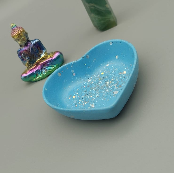 This beautiful heart trinket dish has been made by using neon blue pigment powder, which I have mixed into the Jesmonite compound, and then it was poured into the mould, which had holographic glitter brushed onto.