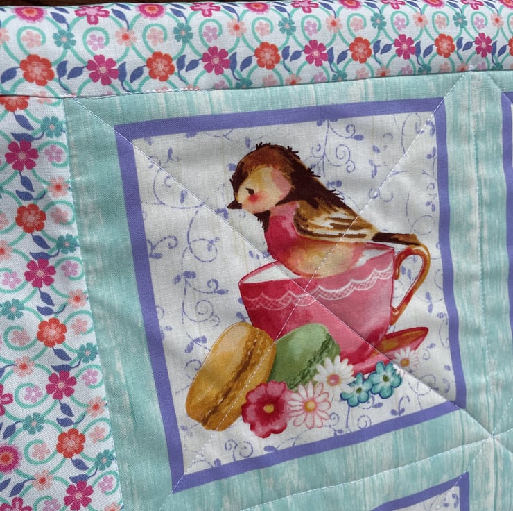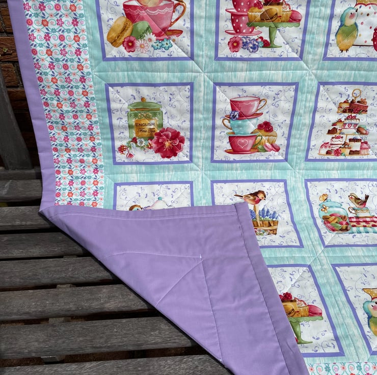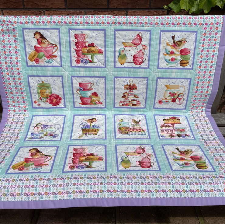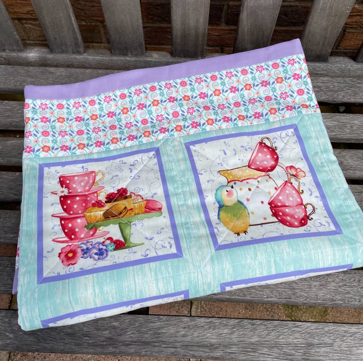 Beautiful handmade patchwork quilt or throw with lovely images of afternoon tea. Would also make lovely picnic throw. Coordinating floral fabric border and bound and backed with lilac fabric. All fabric is high quality quilting fabric 100% cotton. Wadding is bamboo cotton blend. Size 40 x 40 ins.