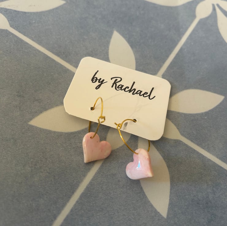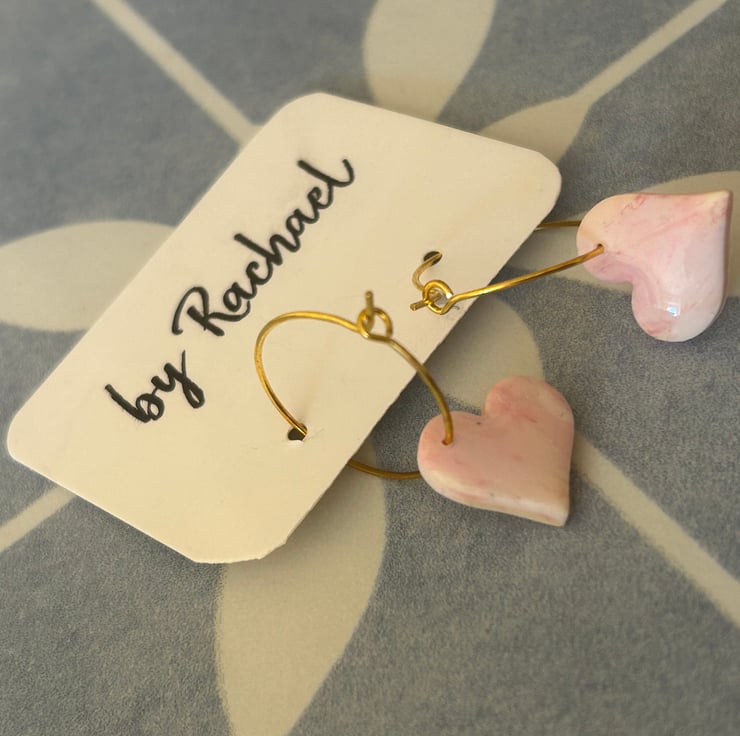 Pink hearts with a slight pale yellow marble effect on golden hoops