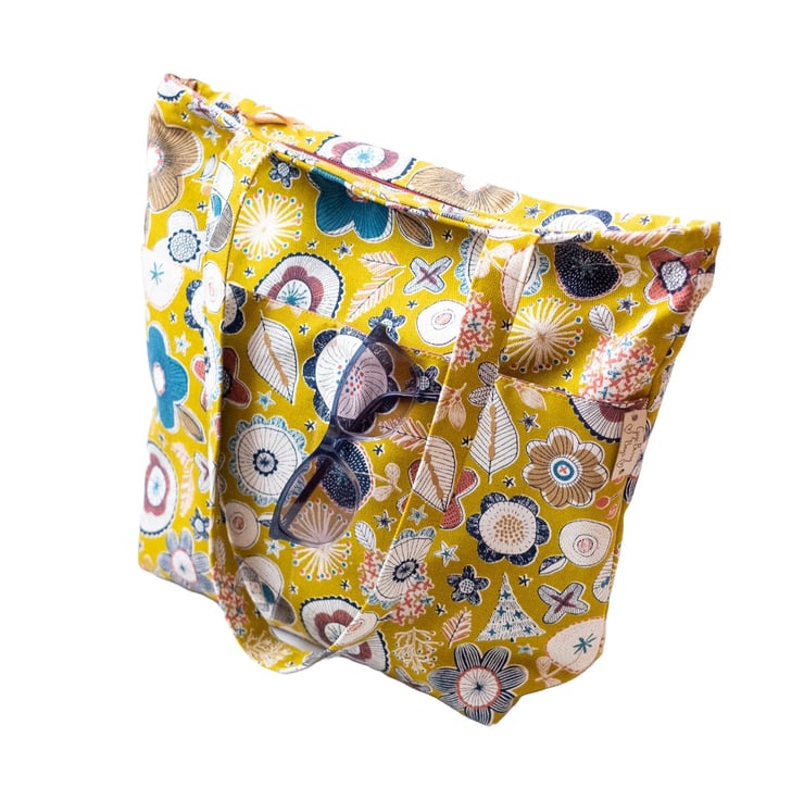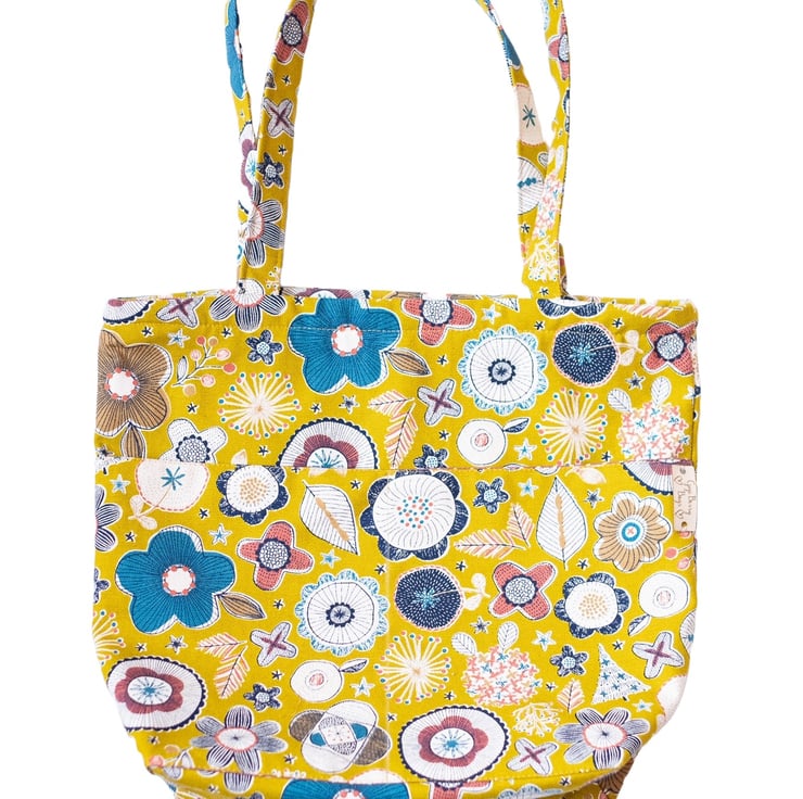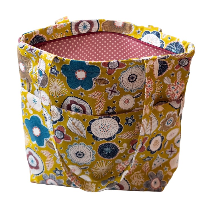 This bright and cheerful tote bag is made from a beautiful multi-coloured flower design fabric and is a ‘one off’, you won’t find another one like it! Mustard/gold coloured background with a cheerful mix of contemporary designed flowers in blue, dark pink and cream. There are two outside pockets which are roomy enough to drop keys and a phone into, or anything else you may need to reach for quickly. The inside is lined with a dark pink and white polka dot fabric and has a large pocket made from the same fabric. The bag has been finished off with a maroon coloured zip and handles long enough to carry this bag over your shoulder. Measurements: 37cm wide by 31cm high with a bottom width of approximately 12cm. Handles from top of bag to shoulder measure approximately 32cm.