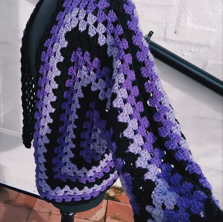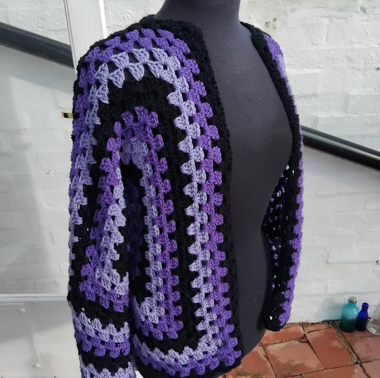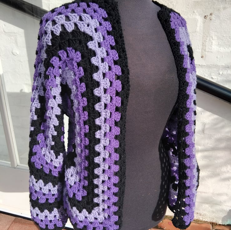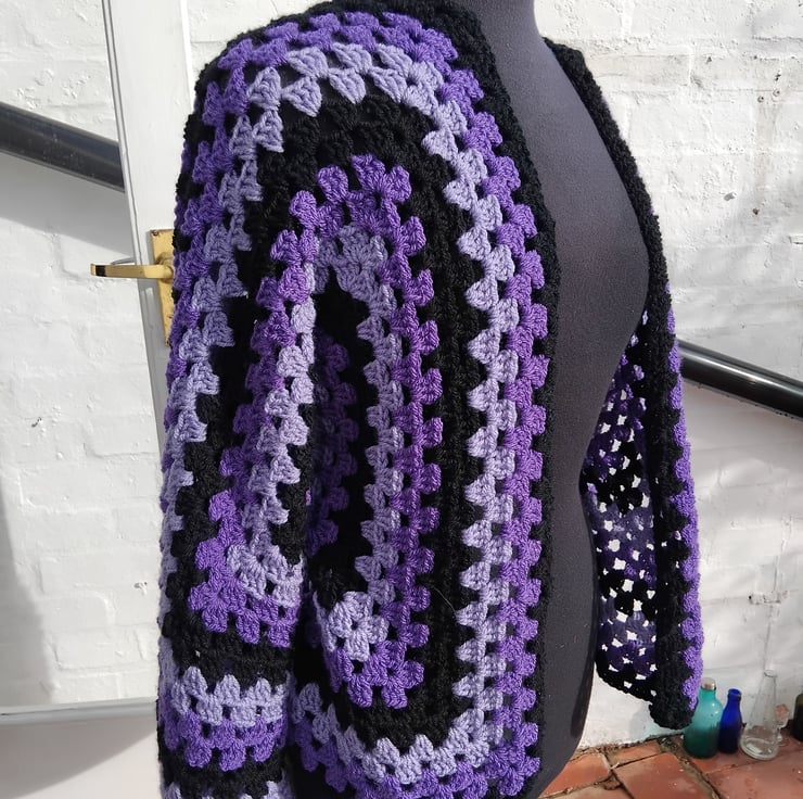 Crochet cardigan in black and purple.